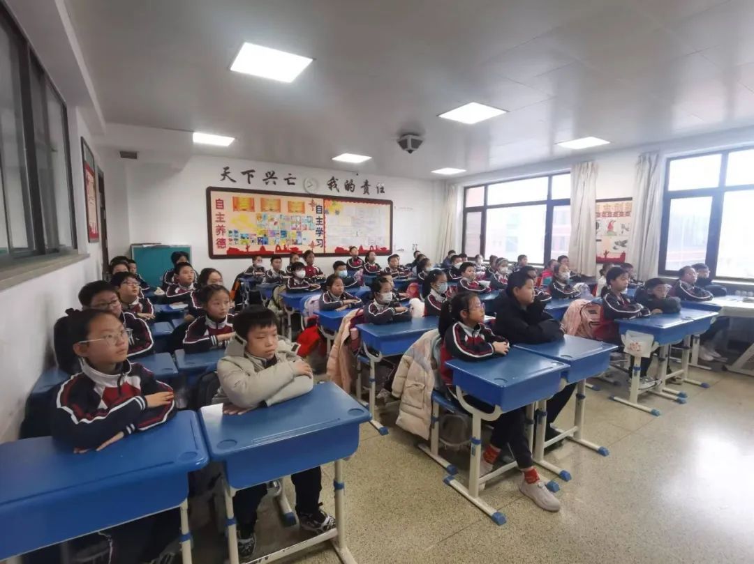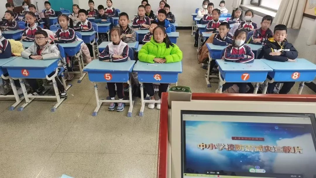 各班级在班主任老师的组织下,观看中小学校防震减灾宣教片。学习校园内不同场景的避震知识、避险技能以及注意事项,学会选择合适的避险位置与正确的避险动作。观看过后,班主任老师指导学生在教室内进行防震避险模拟演练。