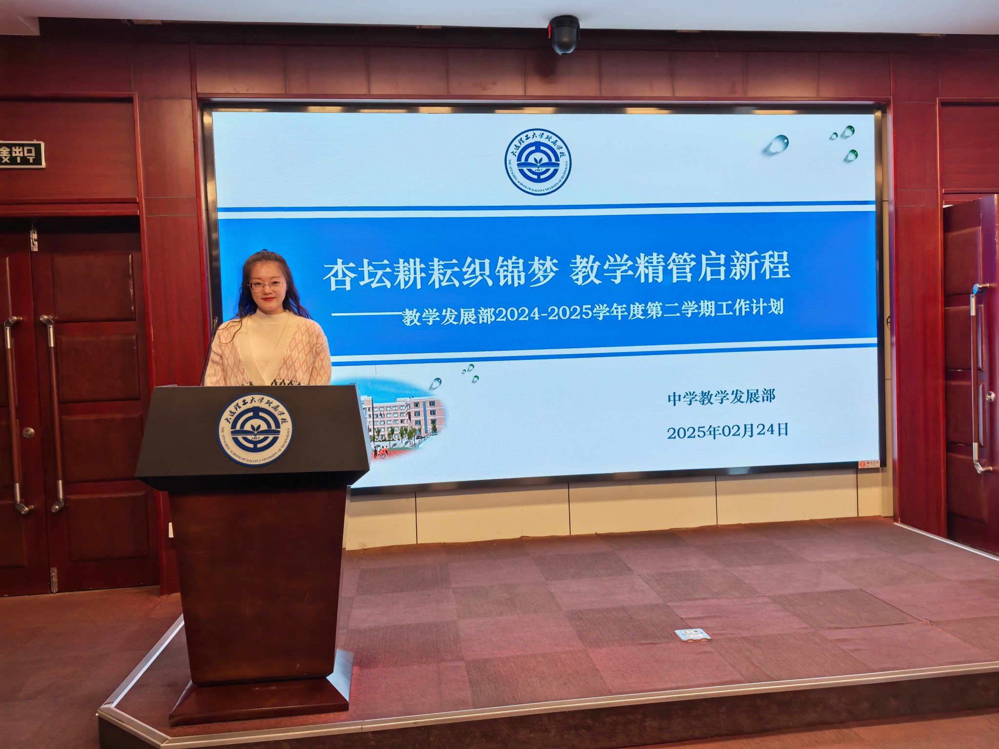 姜竹主任代表中学教学发展部发言,她提出了新学期以“精致常规管理、提升教学质量”为核心的工作目标。她表示,将通过加强集体备课、着重教案检查、健全常态化听评课机制等方面,全面提升教育教学的实效性,努力提高学生的综合素质和学业成绩。