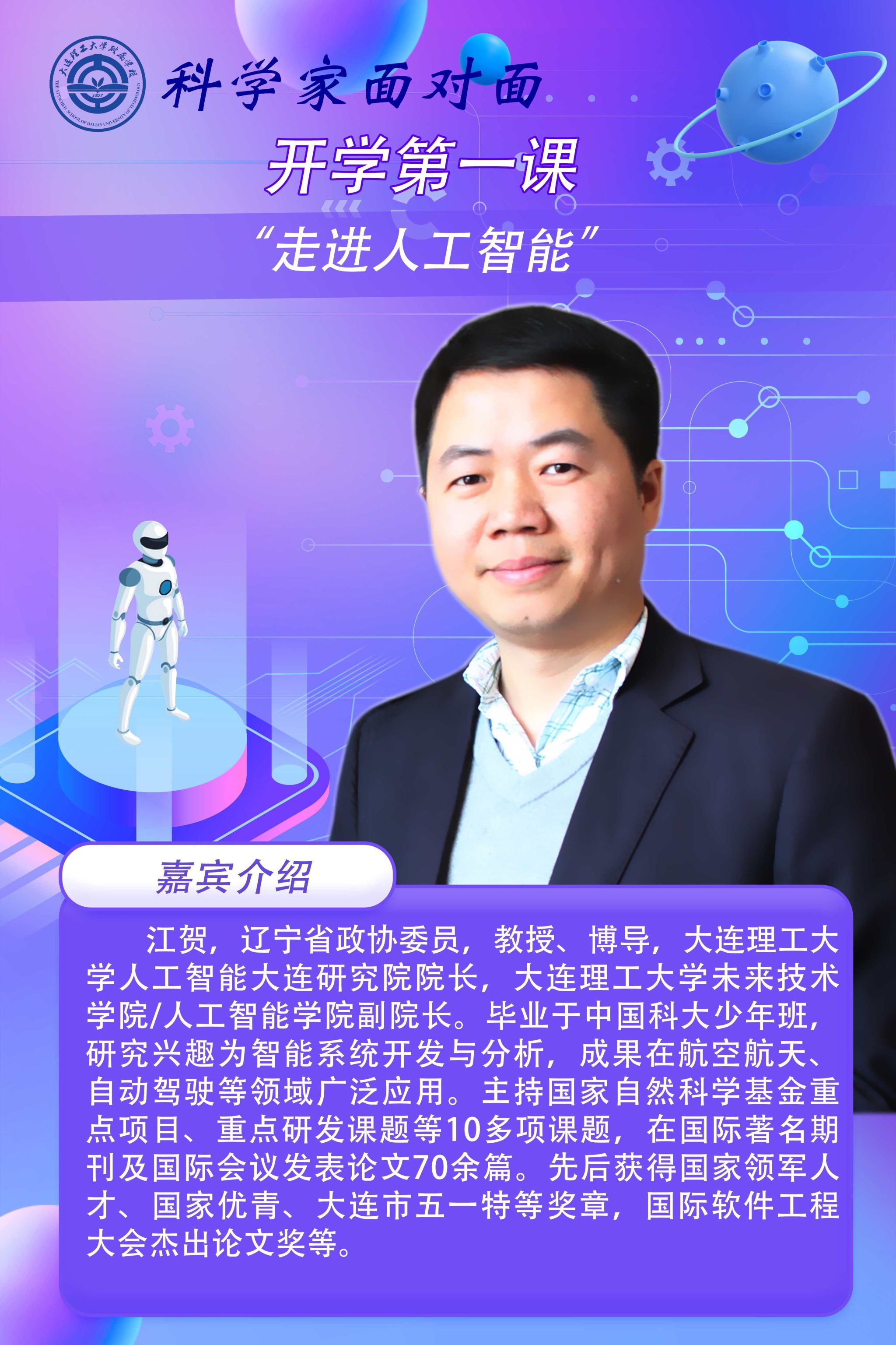 【开学第一课预告】告诉大家一个超棒的消息!新学期的《科学家面对面》之“开学第一课”马上就要和大家见面啦!这次我们邀请到了一位超级厉害的科学家——江贺教授!他将带我们一起开启一段奇妙的人工智能探索之旅。从“什么是人工智能”开始,江教授会用生动有趣的方式,带我们回顾人工智能的三次发展浪潮,揭开它的核心秘密,还会分享人工智能各种的神奇应用,比如DeepSeek、无人驾驶、医疗诊断、海洋探索、智能制造等等!想知道人工智能到底有多酷吗?快来通过海报提前认识一下江贺教授吧!准备好一起涨知识了吗?