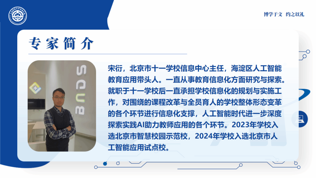 会议由研训部主任张洪伟主持。本次活动特邀北京十一学校信息中心主任宋衍老师作为主讲人。他围绕"解锁AI工具,赋能教师"主题,通过案例演示展示多款AI工具,减轻教师工作负担,提升工作效率和效果。
