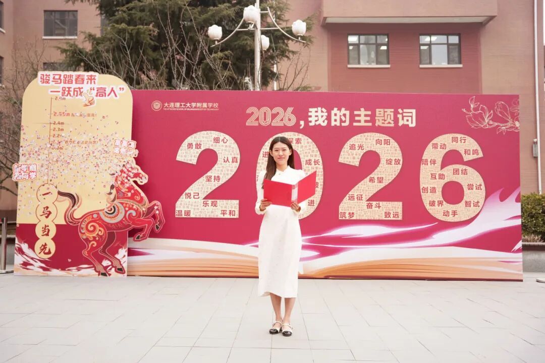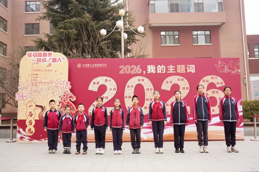 教学楼前,主题板上填满了学生2026年的主题词——“追光”“破茧”“扎根”“探索”……每一个词都是一粒种子,静待发芽。一旁的“跳高板”前,学子们奋力跃起,将“一马当先”贴纸贴向高处,用一跃之姿许下“骏马踏春来,一跃成高人”的新学期誓言。