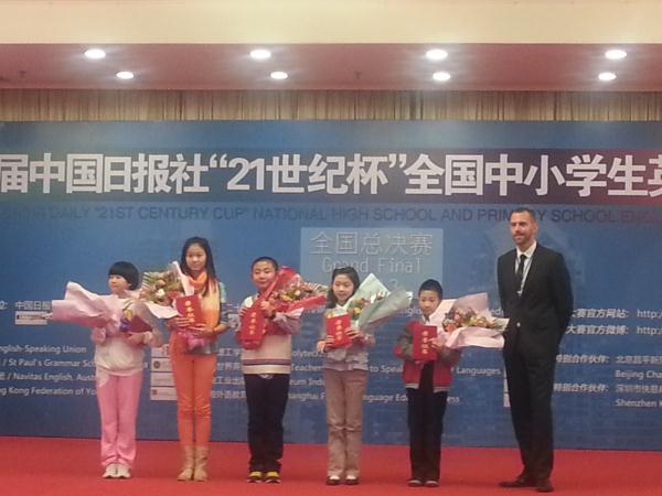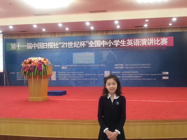 由中国日报主办,21世纪英语教育传媒承办的第十一届中国日报社“21世纪杯”全国中小学生英语演讲比赛总决赛日前在厦门落下帷幕。共有来自全国的32名选手进入总决赛,经过激烈的角逐,在郭芳瑜老师的指导和陪同下,我校车坤睿同学以流利优美的语音语调,睿智机敏的现场问答,沉稳大气的舞台风范夺得全国一等奖,为大连市和理工附校争得了荣誉!