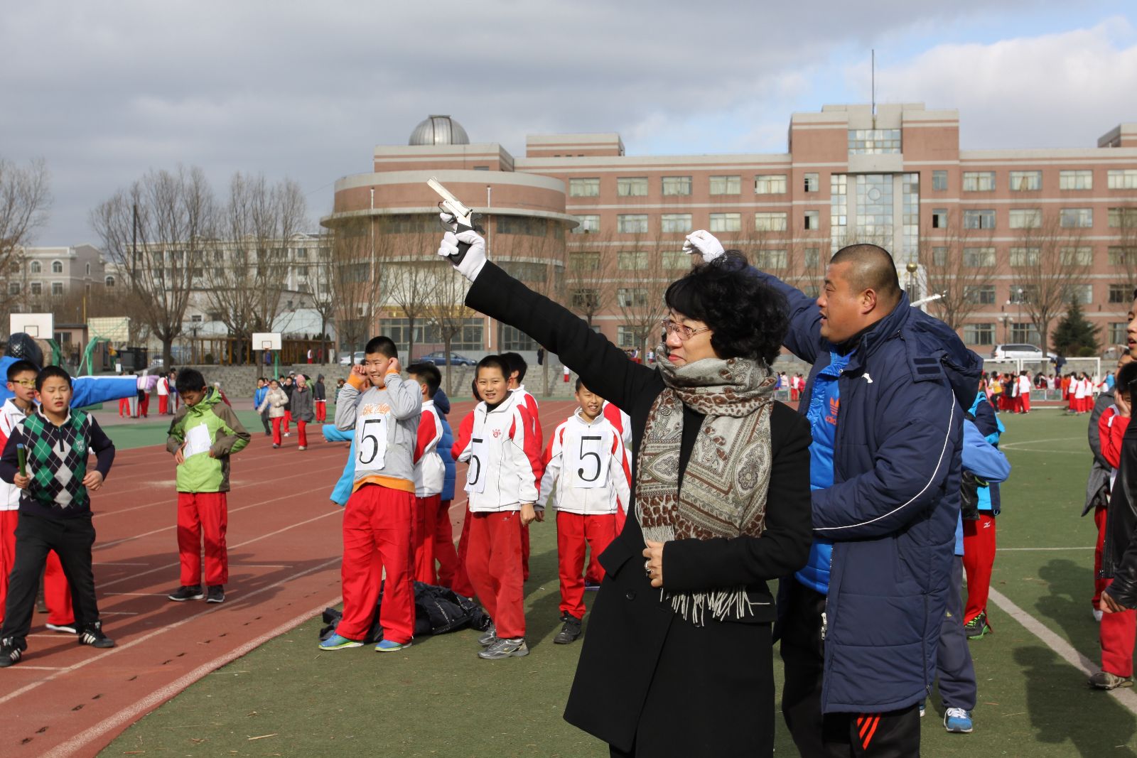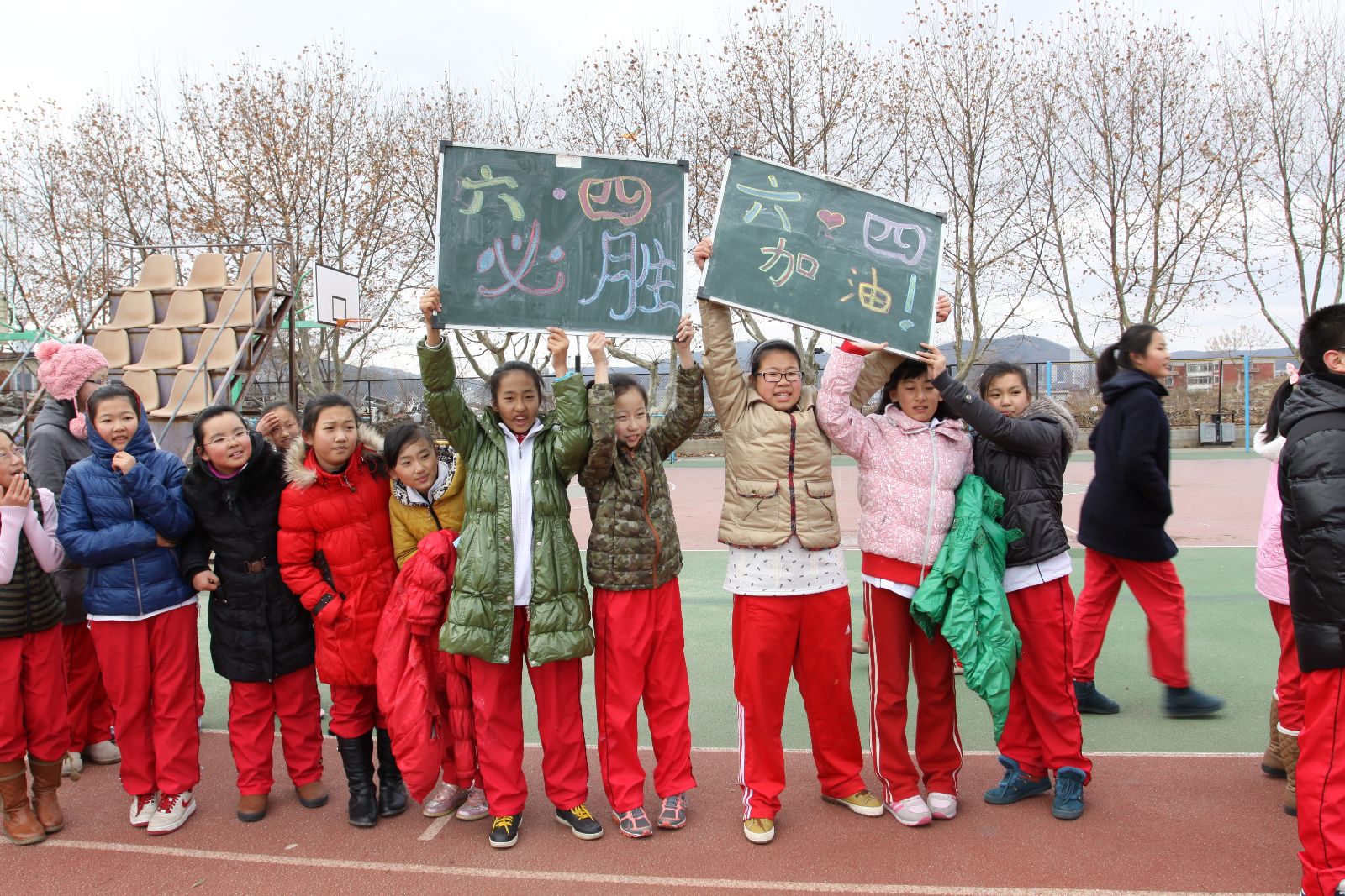 寒冷的北风丝毫没有阻挡学生们的热情。各班学生已早早的来到操场,操场的跑道边上挤满了观看的学生,他们胸前的条幅宛如一道亮丽的彩虹,“加油”“必胜”“友谊第一”的牌子也增添了赛场的热烈气氛。
