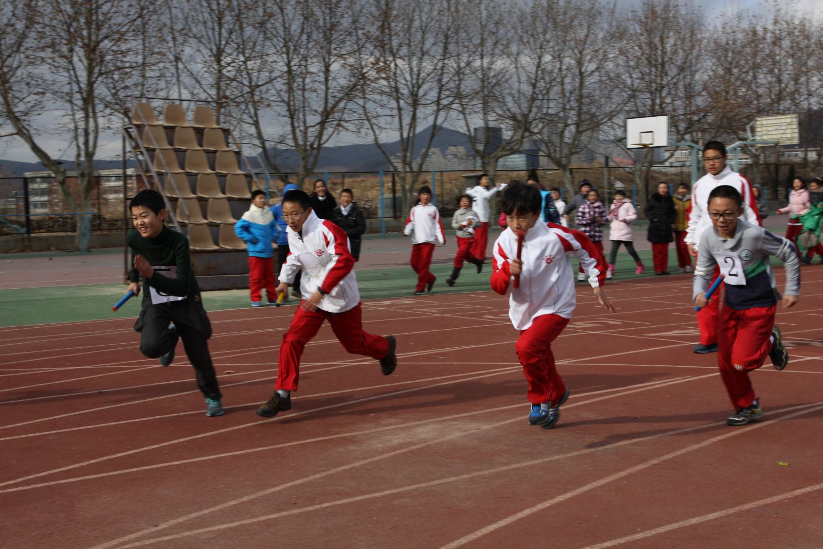 随着体育老师的一声令下,周杰校长手中的发令枪响了。同学们冲出起点,迈着矫健的步伐,手中摆着红、黄、蓝、绿颜色的接力棒,一棒一棒地传递下去,突然一名学生脚下一滑摔倒了,大家赶紧跑过去,这时她自己爬起来又继续参加比赛,同学们为她这种精神响起了阵阵掌声及叫好声。