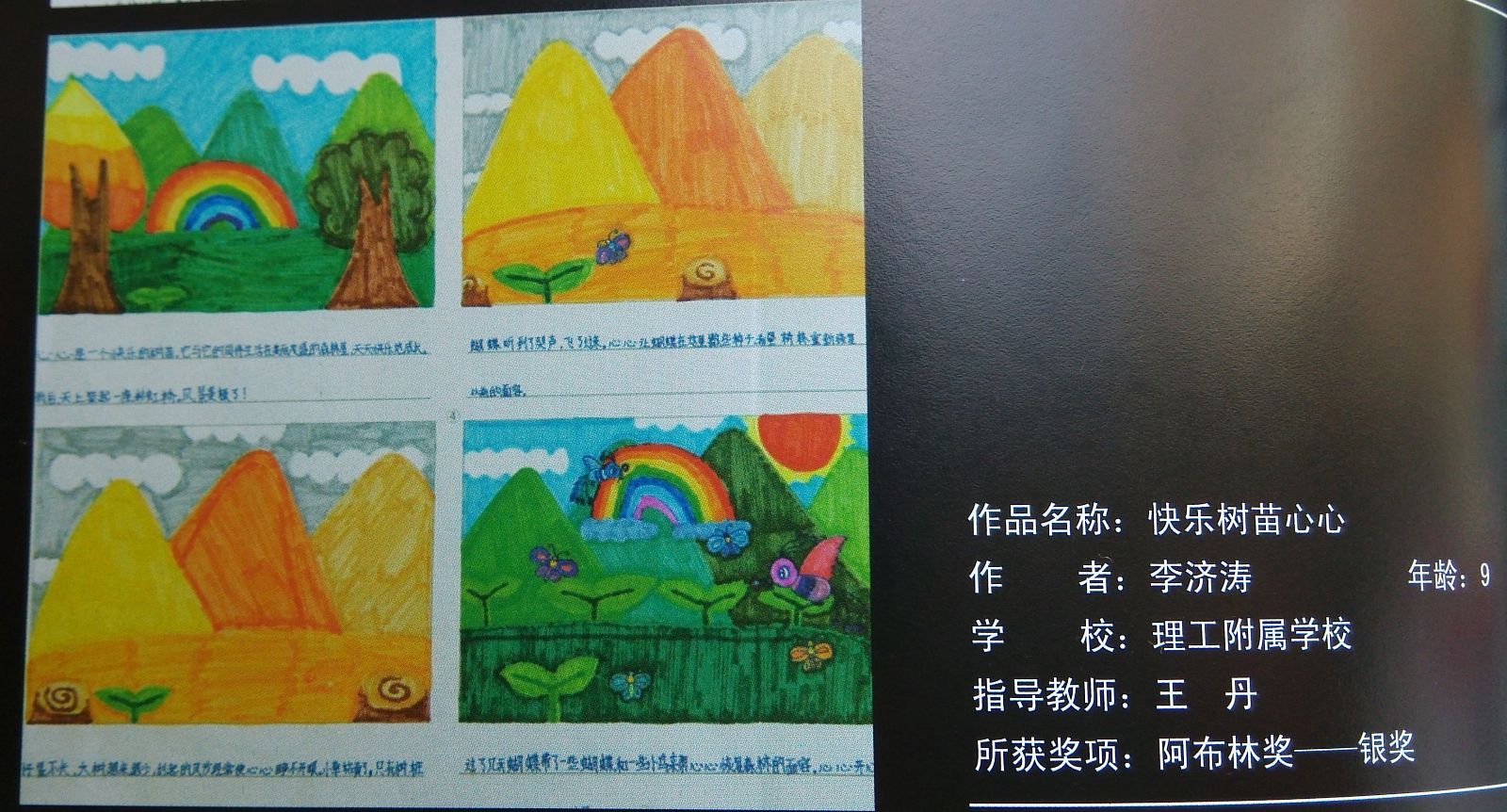 本次比赛主要是以四联漫画的形式,再通过作者自已编写的环保故事或小创意,来表达少年儿童心中的公益梦想。本次活动共有参赛作品6.6万幅,其中获得入围资格的作品2200幅,最终有200幅作品获奖。我校有11名学生作品入围,最终李济涛同学的作品《快乐树苗心》荣获大赛银奖。此比赛,进一步验证我校美术教学在情知教育的背景下集备的成果。