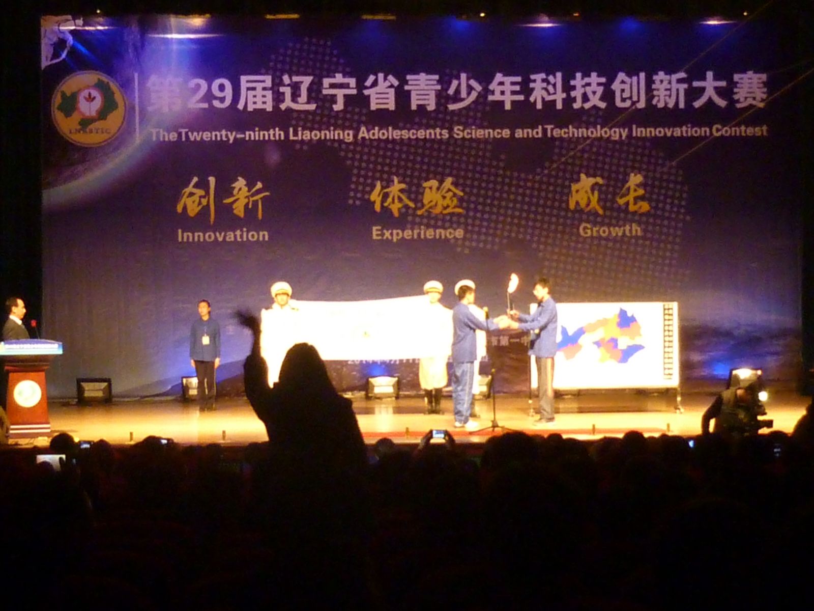 4月11日,我校八年五班学生徐德明参加了在鞍山一中举办的辽宁省大赛,继上次大连市大赛获得第一名后,经过了两个多月的精心准备,徐德明同学不断调整改善自己的参赛作品,最终取得了金奖,用自己的辛勤汗水换取了成功的辉煌。并且代表大连市传递火炬。