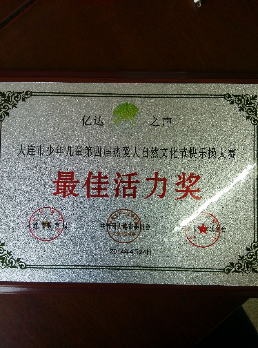 2014年4月24日,我校24名同学参加了大连教育局、团市委、妇联联合承办的大自然快乐操比赛,我校学生代表给大赛评委领导佩戴了鲜红的红领巾。随后的比赛中,我校小同学用精彩、充满活力的演出赢得了现场评委和嘉宾们一致好评,一举获得了最佳活力奖的好成绩。