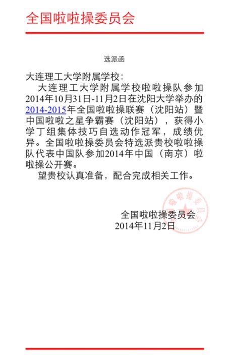 11月1日,由张斌老师领队,刘松、唐昌金老师带队的校啦啦操队正式出征2015年全国啦啦操联赛暨中国啦啦之星争霸赛(沈阳站)比赛。该赛事由国家体育总局体操运动管理中心、国家教育局、中国大学生体育协会、中国中学生体育协会主办,沈阳大学、沈阳市教育局、全国啦啦操委员会承办。比赛中,我校啦啦操队发挥出色,充分展现大工附校积极向上,斗志昂扬的精神风貌。
