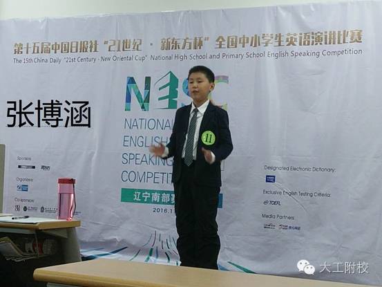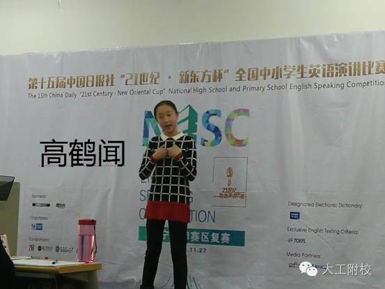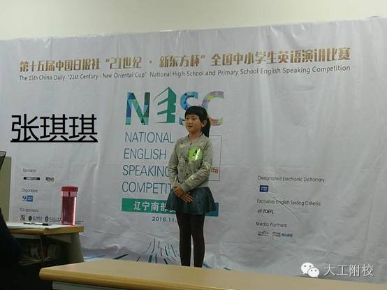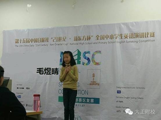 在11月27日举行的第十五届中国日报“21世纪-新东方杯”全国中小学生英语演讲比赛中,大工附校的选手们以流利地道的口语,机智连贯而又充满自信的现场作答等一系列精彩表现,征服了评委和现场观众,让评委们对中小学生演讲最高水平有了新的认识,尤其对大工附校学生的外语水平赞不绝口。