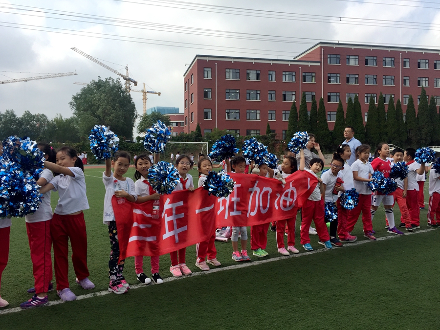 三年一班的啦啦队很是给力,呐喊声响亮,加油横幅和手里的捧花都非常显眼。