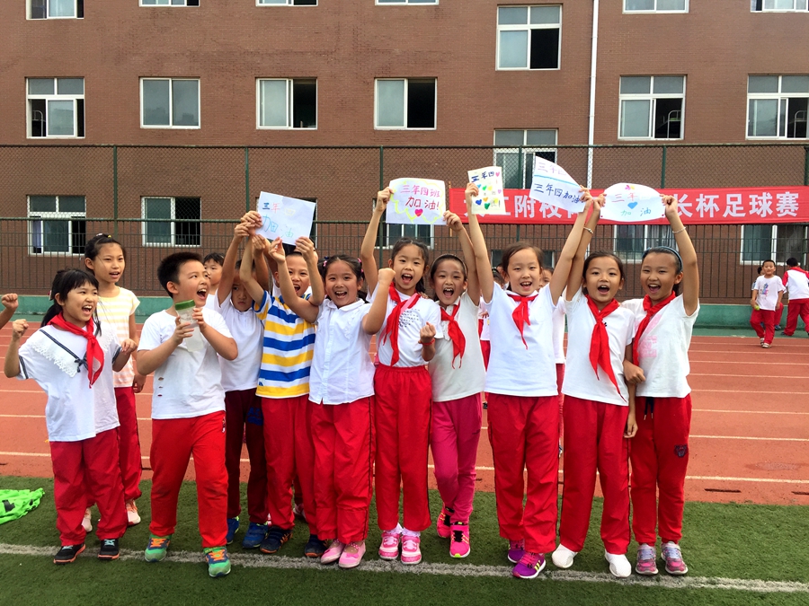 三年四班的啦啦队也不甘示弱,高举自己制作的加油牌,齐声呐喊为自己班加油助威。