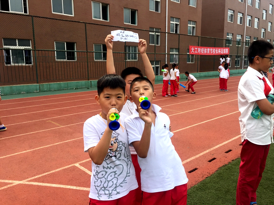 场下的啦啦队使劲儿吹着喇叭为自己班加油呐喊。