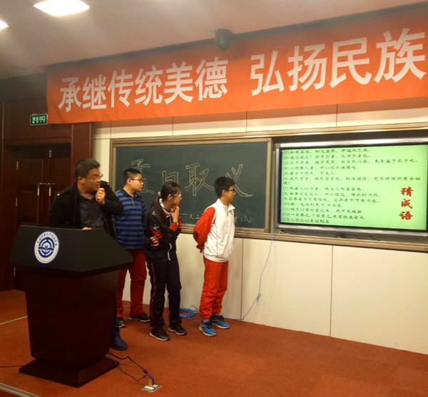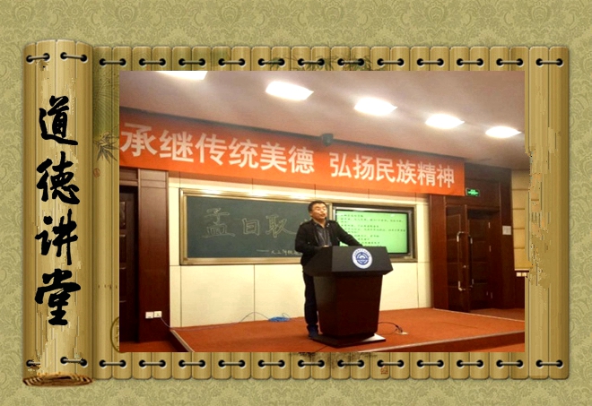 10月27日下午,大工附校二楼阶梯室里,八年级的全体同学汇聚一堂,个个充满期待的样子,文化节里一项重要活动--孟庆丰老师主讲的“道德讲堂”第八讲《孟曰取义》就要开始了。孟庆丰是孩子们特别喜欢的历史老师,他知识广博,课上常常旁征博引;他风趣幽默,课上常常是笑声不断。