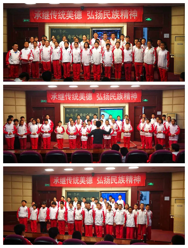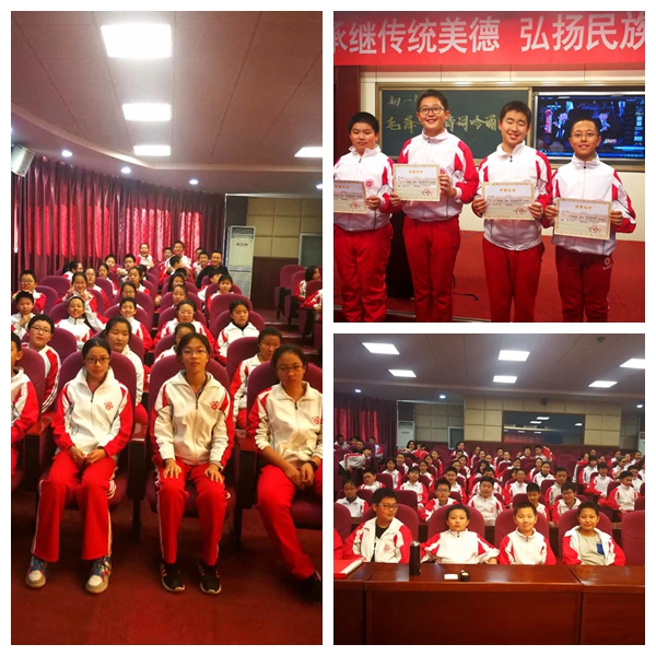 而七年级全体学生在语文老师的带领下,于11月16日中午汇聚二楼阶梯教室,举行“毛泽东诗词吟唱比赛”活动。学生吟唱了《沁园春 长沙 》《水调歌头 游泳》《采桑子 重阳》《娄山关 忆秦娥》这是一次全新的学习诗词的方式,了解诗词创作背景,学生景仰毛泽东在风雨如晦的革命时代的坚强、乐观;激情饱满的朗读,学子们折服于伟人在浓墨丹青中的快意淋漓;抑扬顿挫的音节中,学生沉醉在文学趣味的纯正情意。