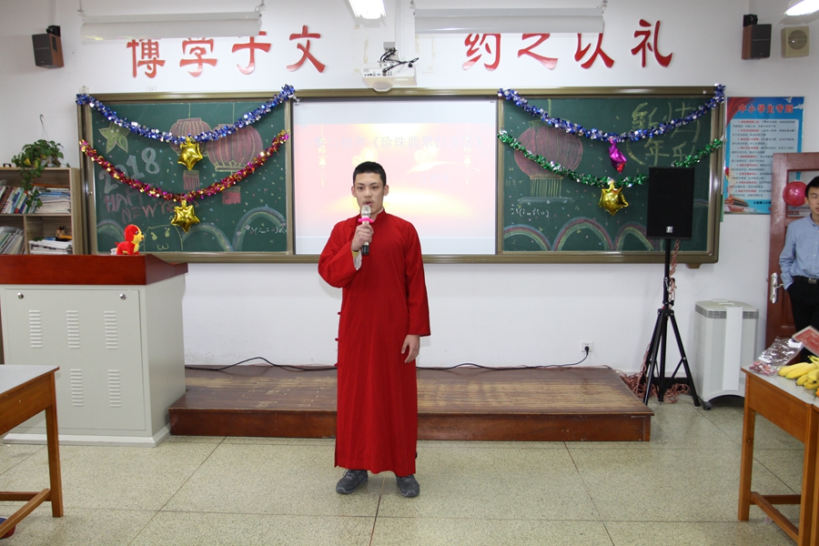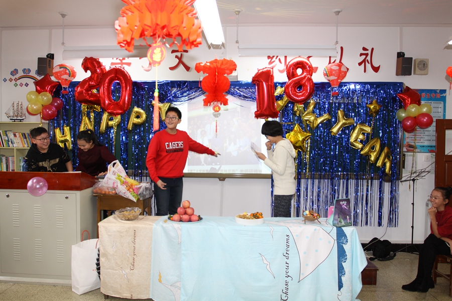 今年的元旦联欢会以班级为单位在教室分别举行。一大早,各个班级已经张灯结彩、装饰一新,处处洋溢着节日的喜庆。
