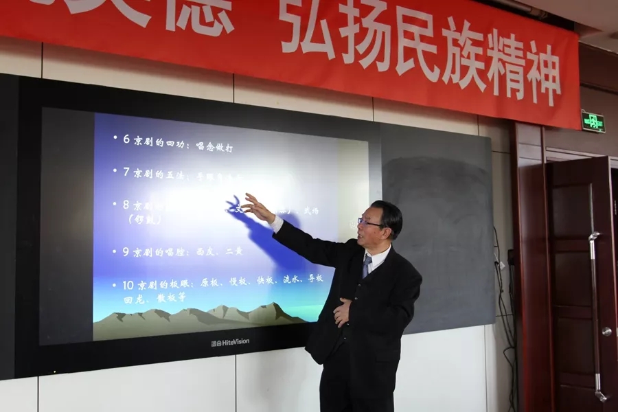 本次讲座以“京剧京腔国粹宝,文化传承不可少”为主题,围绕“京剧的定位和认识”、“京歌京剧的瑰宝”、“京剧启蒙的内容”以及“学唱京剧的步骤”四个篇章展开。