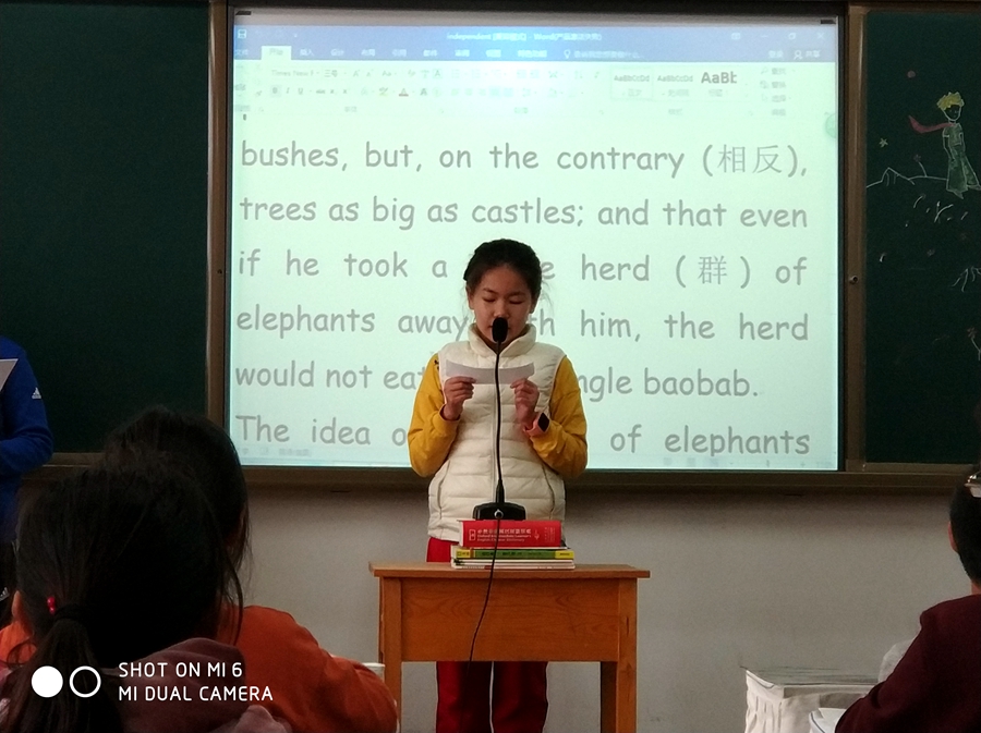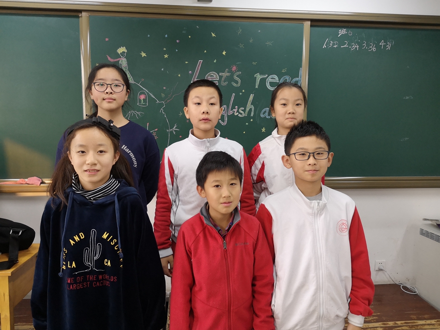六年二班在张洪伟老师的带领下阅读英文版《小王子》已两月有余。此次比赛,既是为发展学生表达和交流能力,提升语言学习能力,也是对两个多月来阅读成果的一次检验。参赛同学抽签组队,朗读《小王子》前21课需要朗读的段落。比赛紧张有序,高潮迭起。最终,丛娇娇、金易行、邓钧元、高子涵和南望等同学获得了前五名,其所在的小组也顺利胜出。六年二班全体同学以及三位家长代表参加了本次活动。