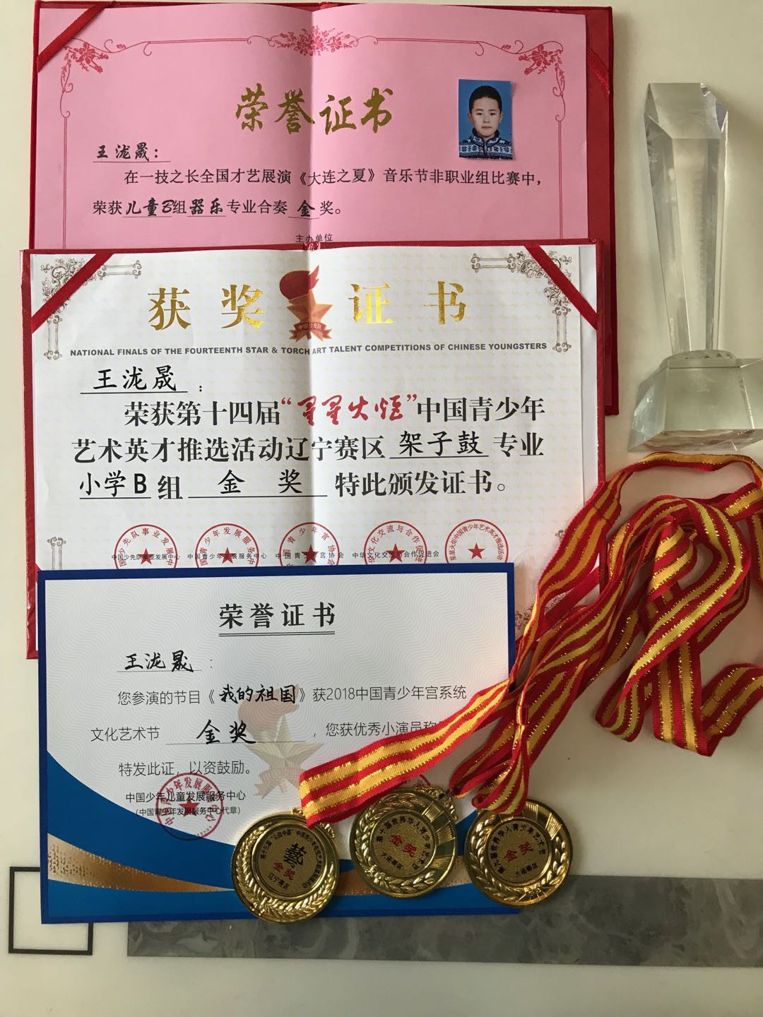 在保证学习的前提下,他还爱好广泛:游泳、足球、朗诵、架子鼓、二胡。架子鼓已经取得十级证书、并多次获得比赛金奖;作为大连市青少年宫民乐团的二胡手,参加2018年全国青少年宫系统文化艺术节并获得金奖。这些丰富的业余爱好不仅让他在班级活动中能“露一小手”,更主要的是能够陶冶情操、提高素养。