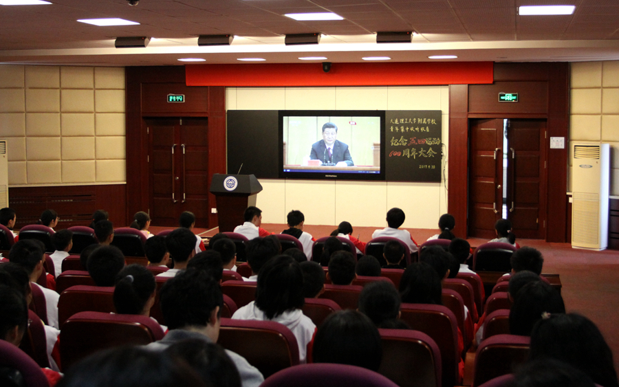 4月30日10点30分,大连理工大学附属学校组织部分教师、团员及青年学生,收看了“纪念五四运动一百周年大会”直播。