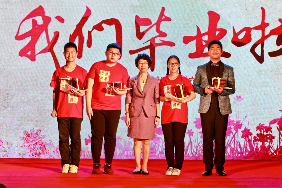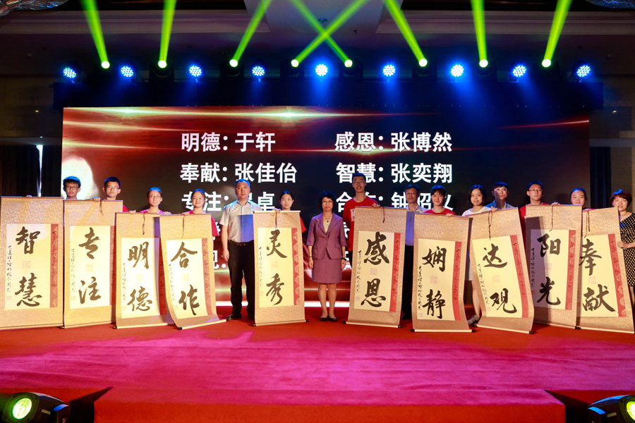 接下来进入“大工附校2019届校园风云人物”颁奖环节。田晓明书记揭晓我校2019届校园十大风云人物代表,校领导和嘉宾为我校2019十大校园风云人物代表颁奖并合影留念。