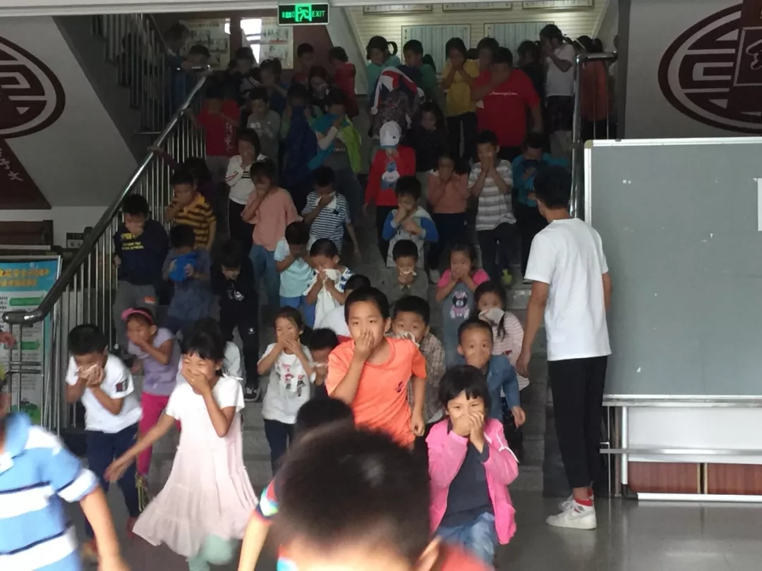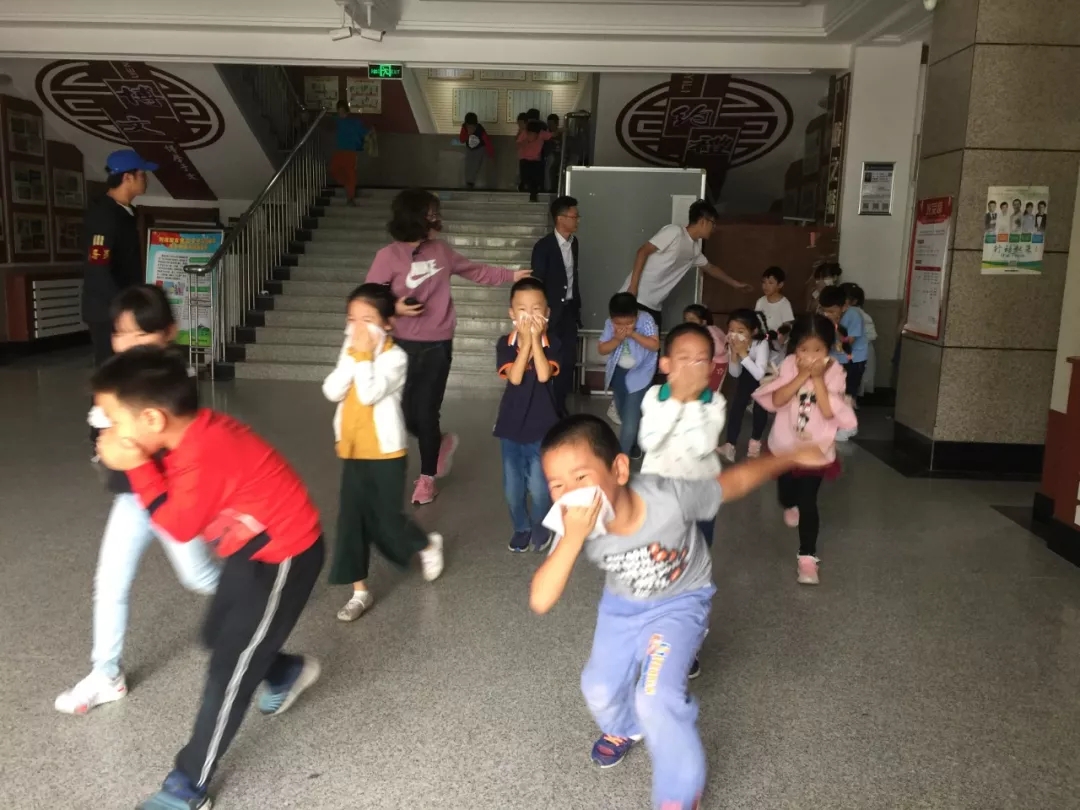 小一新生弯腰,低头,掩住口鼻,在班主任老师的带领下,井然有序地从撤离,疏散过程中做到了不拥挤、不乱说话、不掉队。