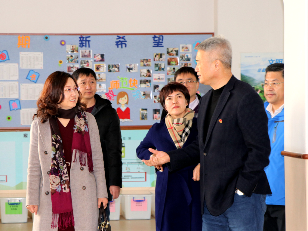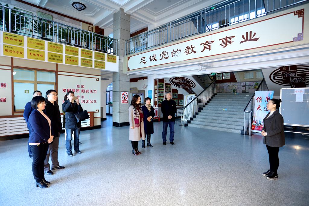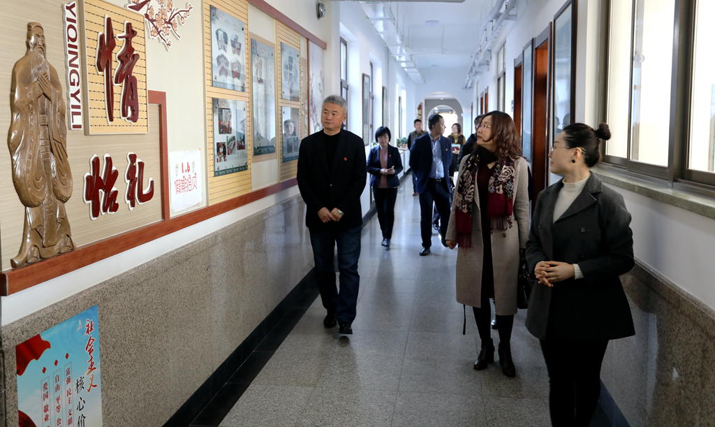 我校校长王东、党总支书记田晓明、副校长赵欣欣、赵霞等陪同客人先后参观了我校的一楼正厅办学理念展板、院士长廊、孔子像、走廊文化和中小学两个图书馆,最后在415会议室双方进行校际交流。