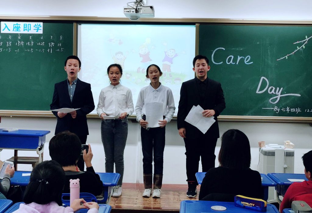 Care Day源起七年四班何沛宽同学的一个班级节日创意。经与部分家长讨论后,决定将每年的12月1日定为班级节日---Care Day,取谐音“一二一,齐步走”,四班共同向前,一起成长之意。今年的Care Day因筹备推迟举行。