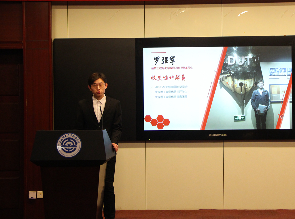 大连理工大学2018-2019学年“自立自强标兵”代表施勃帆、范忠岗,分享了自强不息的成长故事与奋斗足迹;“勤工助学之星”罗强军分享担任校史馆讲解员的经历,并讲述屈伯川老院长的故事,感动了在场的每位同学;“红色基因宣讲团”成员刘丹,用50级校友吴庭赞的个人经历为同学们分享大工人的“家国情怀”;“红色基因宣讲团”成员王宇航,以探索革命根据地井冈山为线,声情并茂地讲述了革命战争年代的艰辛与伟大,勉励同学们将井岗精神发扬光大。