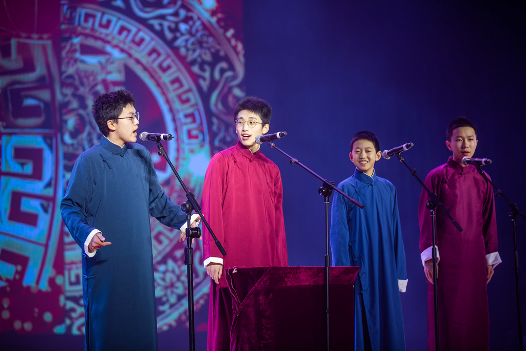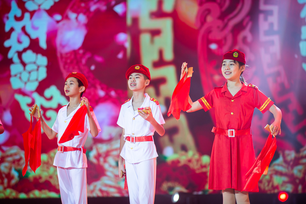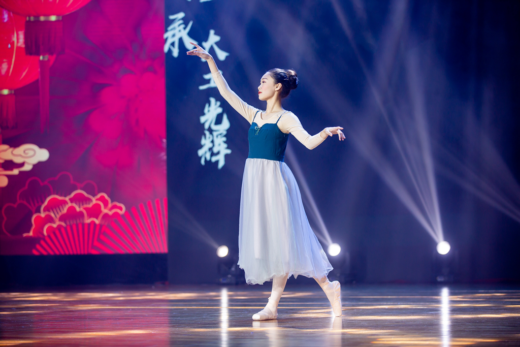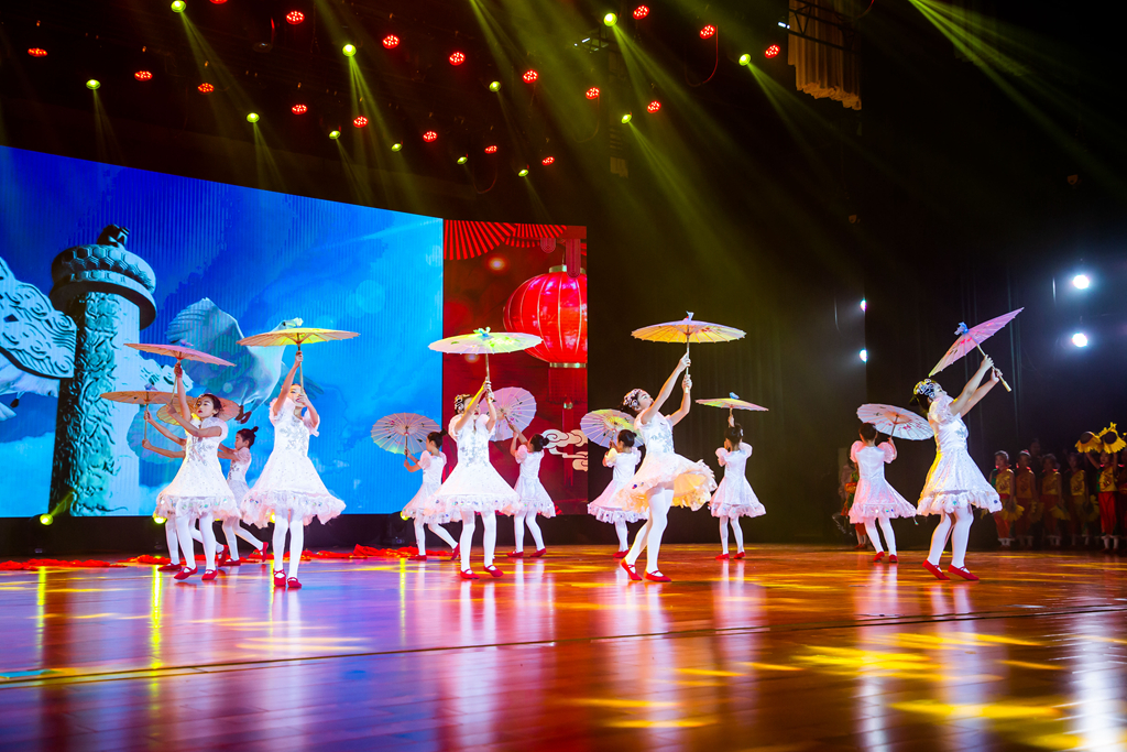 第二篇章,我爱你中国。诗朗诵《巍巍中华 悠悠我心》《不忘初心,牢记使命》,表现出工附师生对祖国的拳拳赤诚;戏歌《我爱你中国》,古腔古韵、雍容典雅;舞蹈《欢庆》,描绘出盛世华年的喜悦和幸福。一歌一咏、双袖转蓬,寄托了师生们对伟大祖国深深的热爱和生活在新时代的无限自豪。