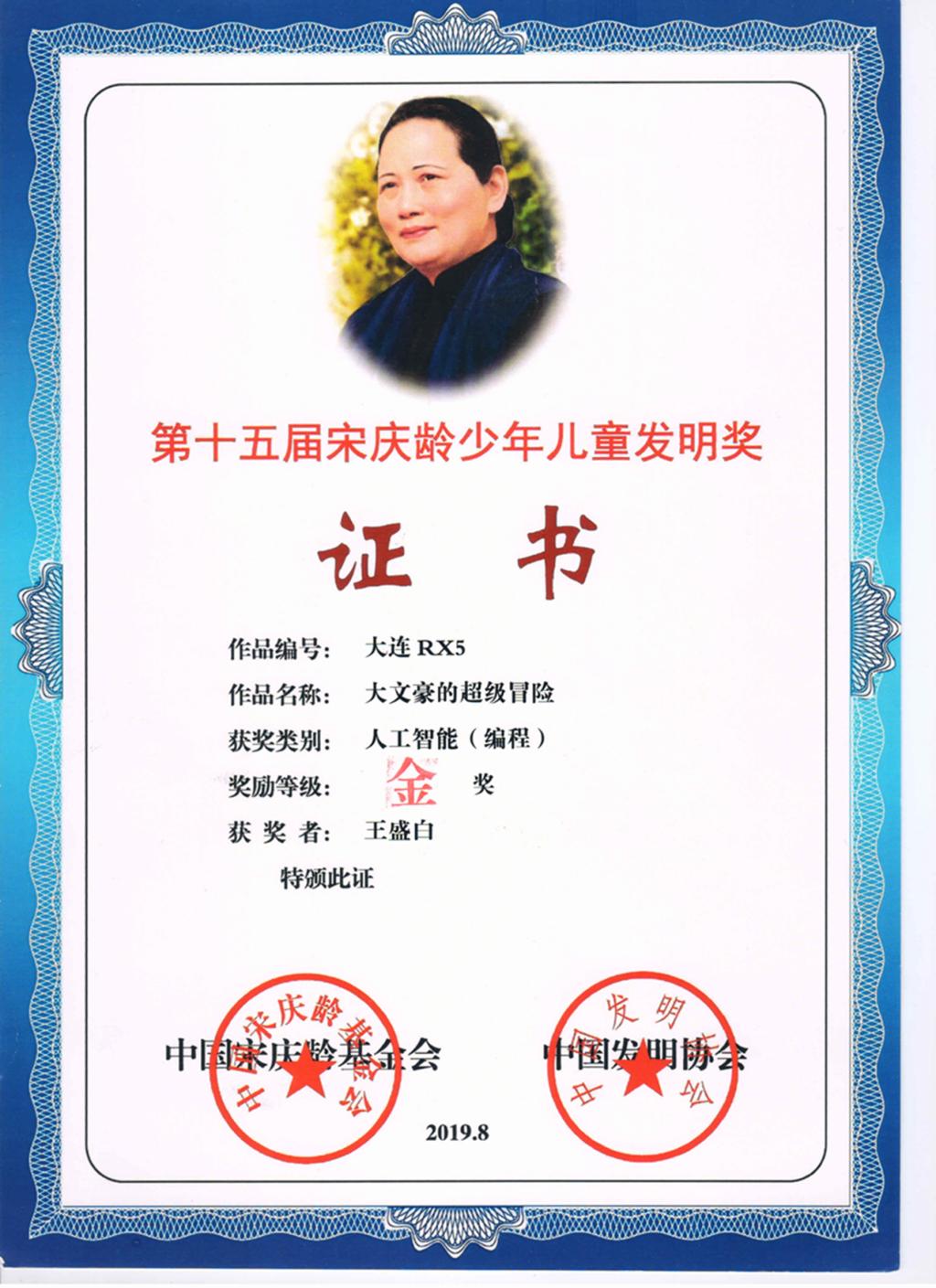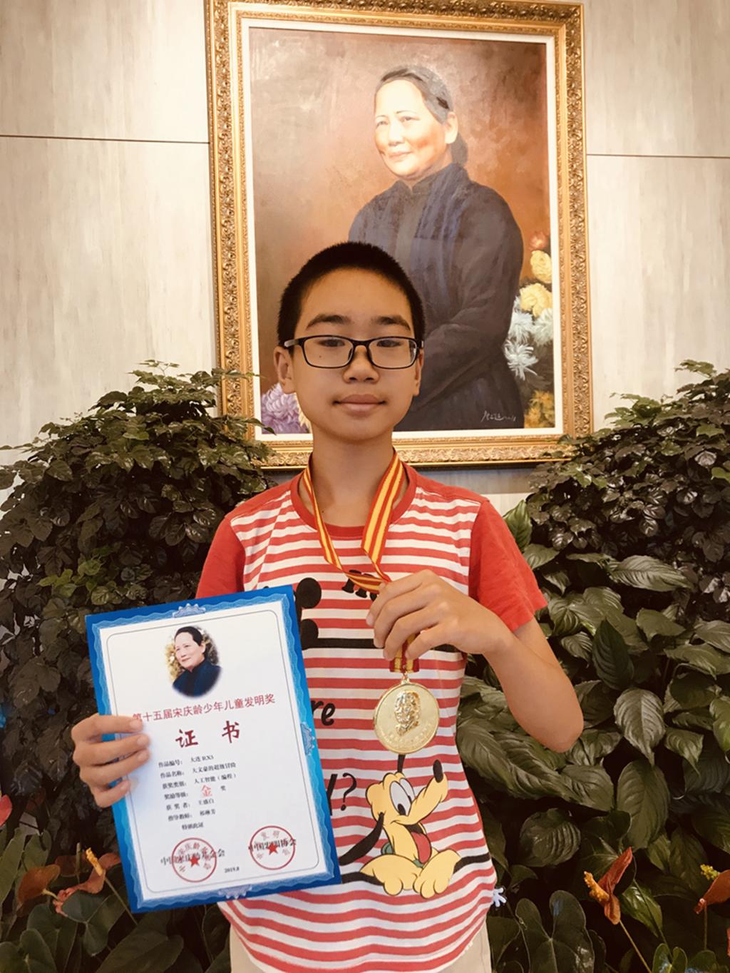 王盛白同学从小就喜欢计算机编程,曾经两次获得辽宁省信息技术奥林匹克竞赛二等奖和其他创新创意作品奖项。2019年获得第十五届宋庆龄儿童发明奖金奖,由中国第一个登上太空的航天员杨利伟亲自为他颁发了金牌。