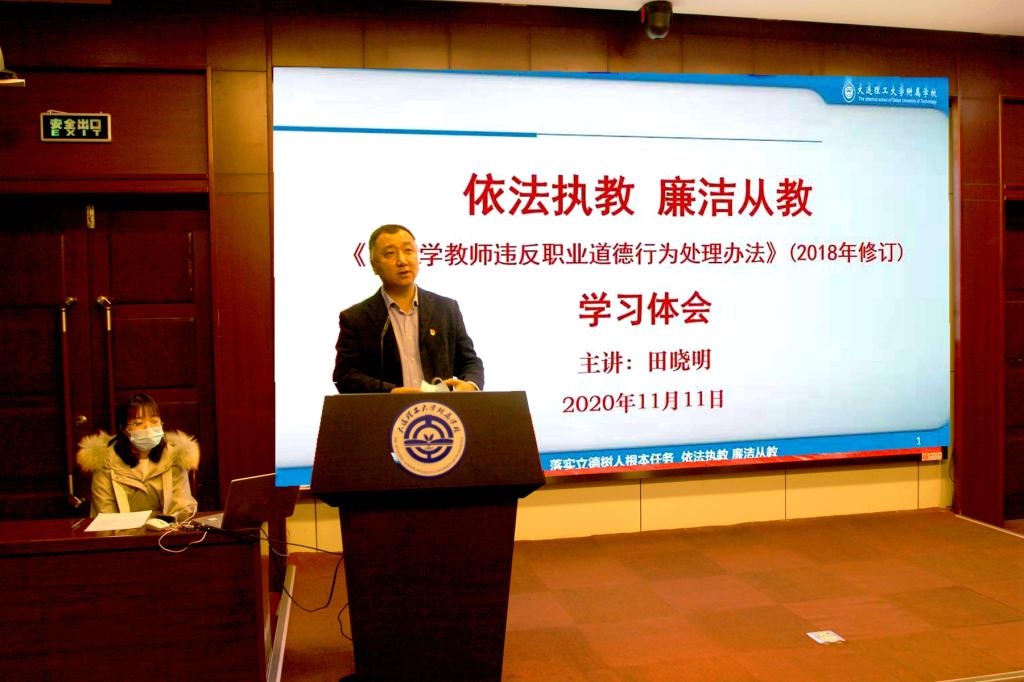按照大连理工大学“廉洁教育活动月”安排,附属学校开展了一系列活动。11月11日下午,在我校二楼多功能厅,校党总支书记田晓明给全体班子成员、党员共95人做了“依法执教、廉洁从教”专题讲座。