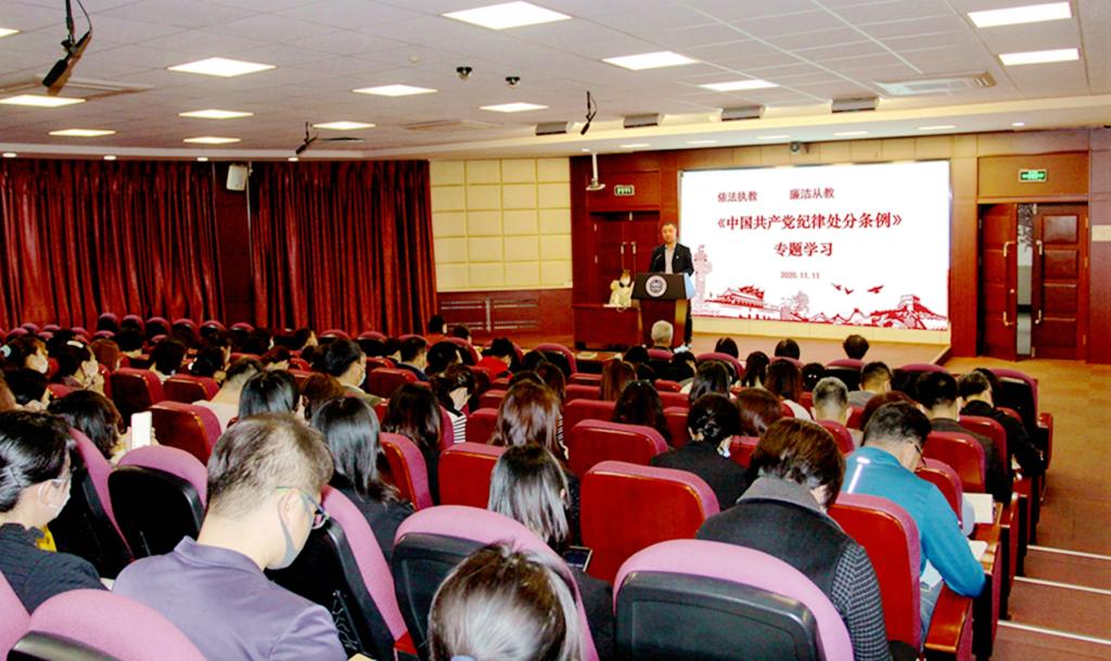 田晓明书记为大家详细解读了《中国共产党纪律处分条例》和《中小学教师违反职业道德行为处理办法》,谈了自己的学习体会,用实际案例有针对性的对教师的从教行为进行指导和规范,要求全体党员干部教师知红线、守底线,努力干好本职工作。