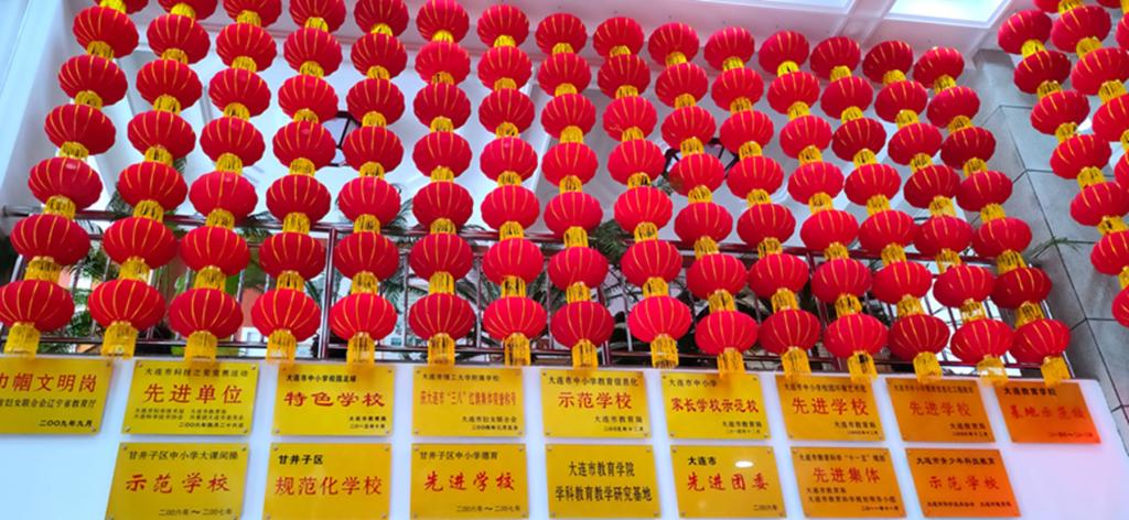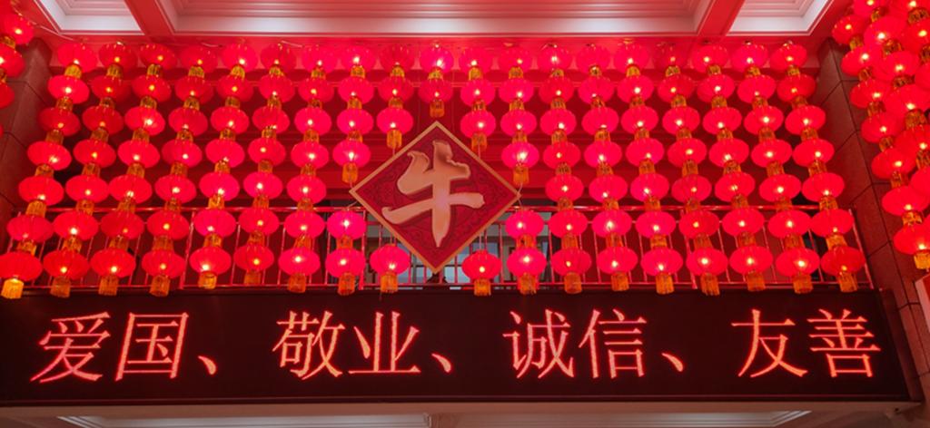 一颗赤心潋潋满,千盏红灯闪闪明:一楼大厅内外,大红灯笼墙高高挂起、喜气洋洋。中国的灯笼起源于1800多年前的西汉时期,岁月荏苒,红灯高挂早已经成为中国人民族心理的重要元素,象征着团圆、喜庆、热闹和兴旺。一走进教学楼,看到两侧的灯笼墙红红火火,各班级贴的精致的窗花和可爱的小饰物,顿时浓浓的节日气息扑面而来。