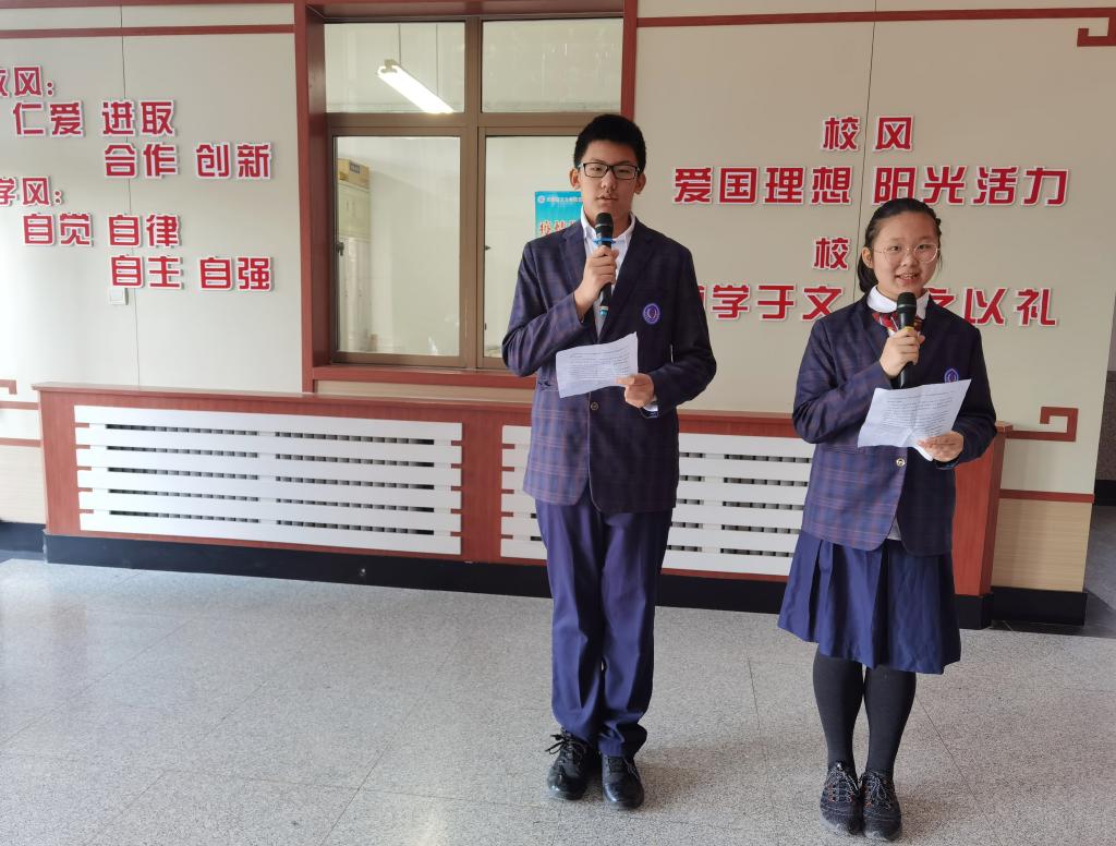 仪式在庄严的国歌声中开始。主持人车星炫和梁瑞庭两位同学以“我们为什么要来到学校、为什么要努力奋斗、为什么而学习”三个问题向同学们发问。随后,姜雨杉、金兆暄两位同学进行题为“我们为什么而学习”国旗下演讲。他们以周恩来总理“为中华之崛起而读书”的豪气,以陈景润院士攻克“哥德巴赫猜想”的志气,以钟南山院士奔赴前线救死扶伤的正气为例,强调学习的目的“不是为了父母,不是为了个人利益,而是为了让我们的生活更加文明富庶,为了让大家热爱的祖国更加繁荣昌盛”。