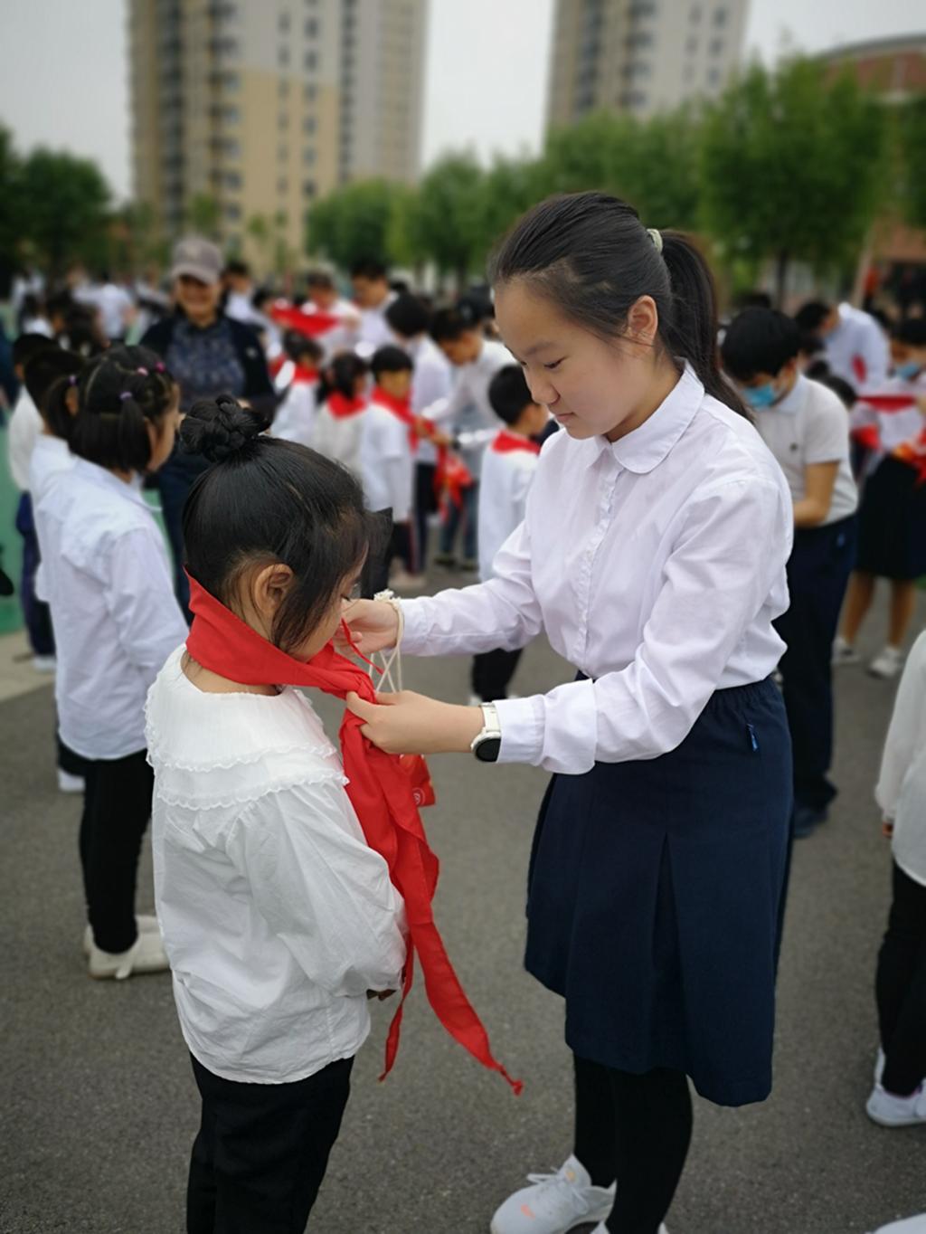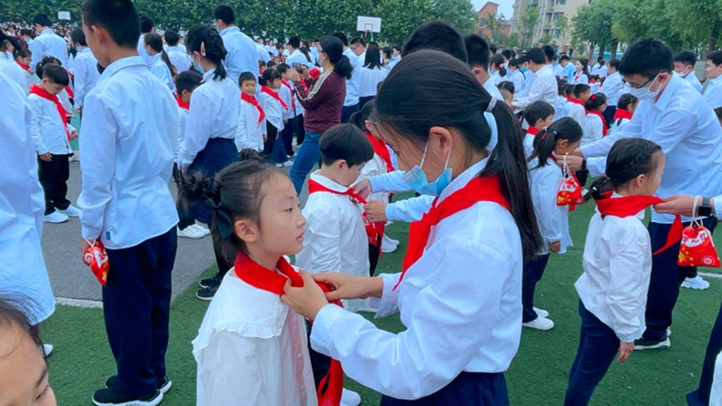 仪式第六项聘任一年级班主任为中队辅导员,优秀队员为中队辅导员老师们带上红领巾,大队辅导员张老师授中队旗。