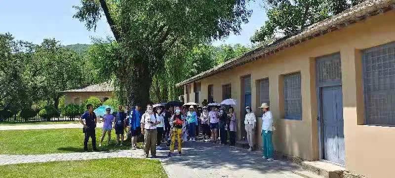 随后,我们一行人又来到了今天培训学习的第二站——杨家岭革命旧址。杨家岭是中共中央驻地旧址,1938年11月至1947年3月,毛泽东、周恩来、任弼时等中央领导和中共中央机关都曾在此居住。走进杨家岭,一栋2层小楼肃然屹立,中西合璧的建筑风格,蓝色的窗子,灰色的墙体,礼堂外部有着西方的建筑风格。走进内部,是典型的陕北窑洞的元素,这是中国共产党历经两年修建而成的中央大礼堂。在这里,隆重召开了党的第七次全国代表大会。毛泽东等老一辈革命家在杨家岭居住期间,从事了大量的理论研究工作,深刻总结了统一战线、武装斗争和党的建设等宝贵的革命经验。