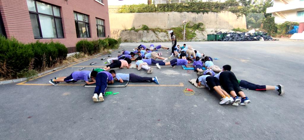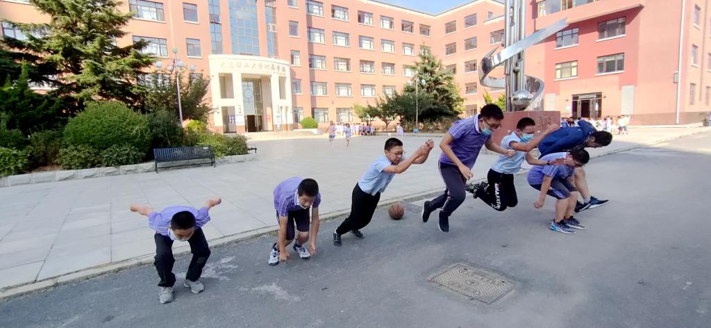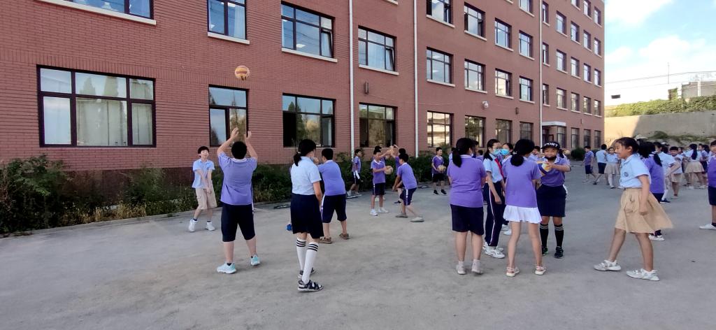 中学,七八年级在教学楼西侧,九年级在东侧操场。自主练习时间七年级学生学习中学生广播体操,八年级学生安排在教学楼前练习中考体育项目-立定跳远,九年级在操场进行体育中考项目的练习。