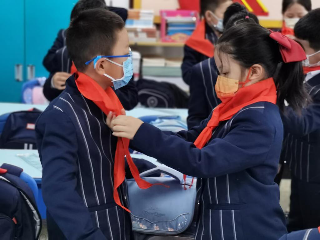 在庄严的队歌声中,本次入队的新队员们为自己戴上了鲜艳的红领巾。骄傲和自豪的神情在他们的脸庞浮现,相信此情此景会为他们留下终生难忘的印象。