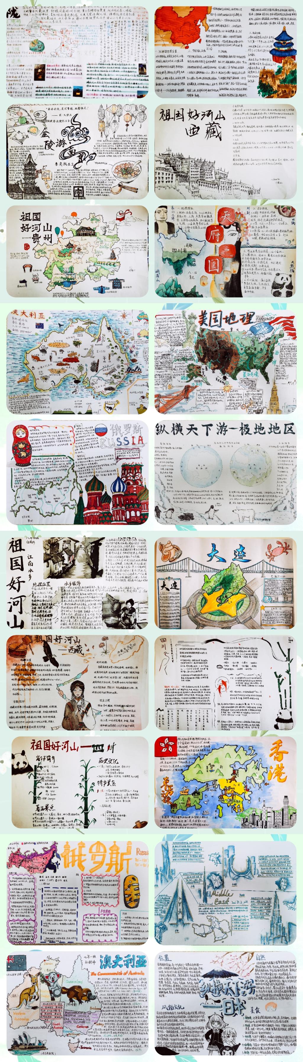 地理是一门集科学性、实践性和趣味性于一体的学科,结合学科特点,七、八年级分别以“纵横天下游”、“祖国好河山”为主题,进行手抄报制作。要求突出地理学科特点,图文并茂、字迹工整,内容可以是这个区域的位置、自然、人文、风俗、美食、旅游攻略等等。通过介绍一个感兴趣的国家或者地区,有助于学生感受不同区域的自然地理、人文地理特征,对进一步学习带来帮助。