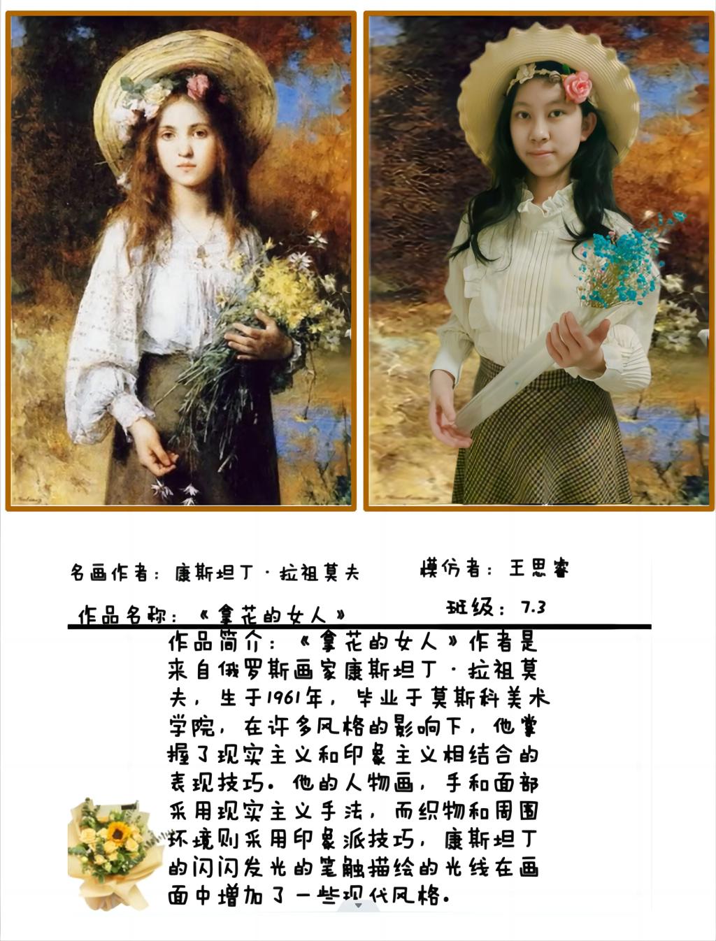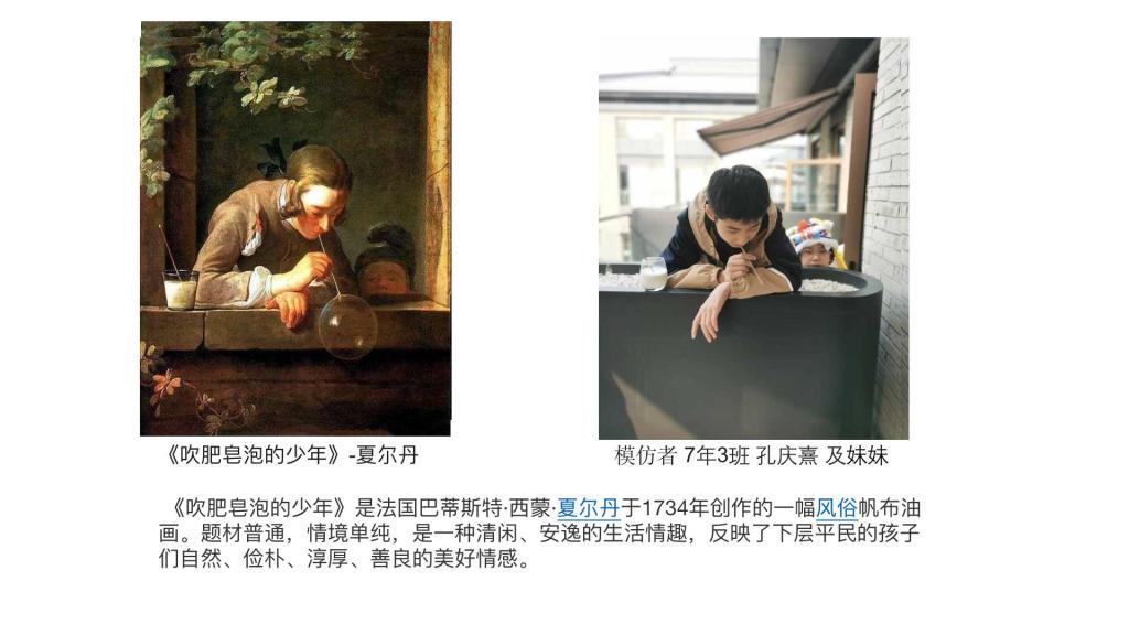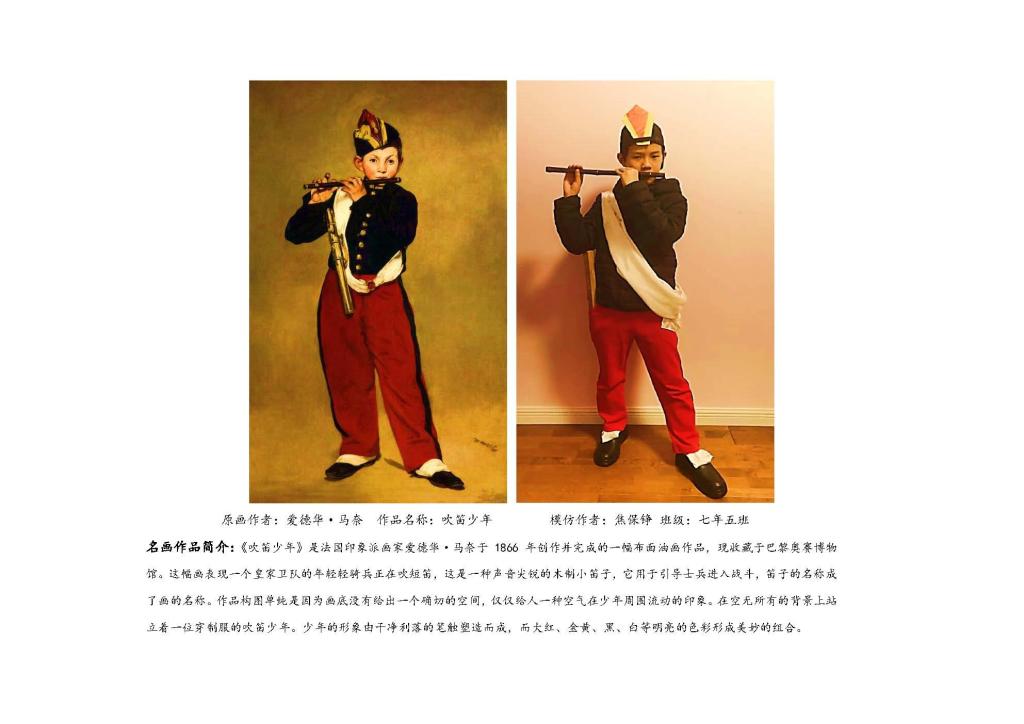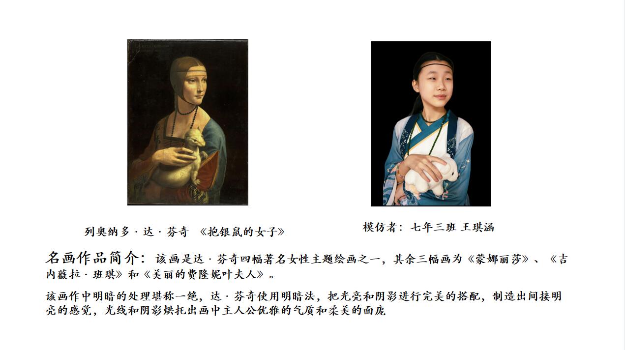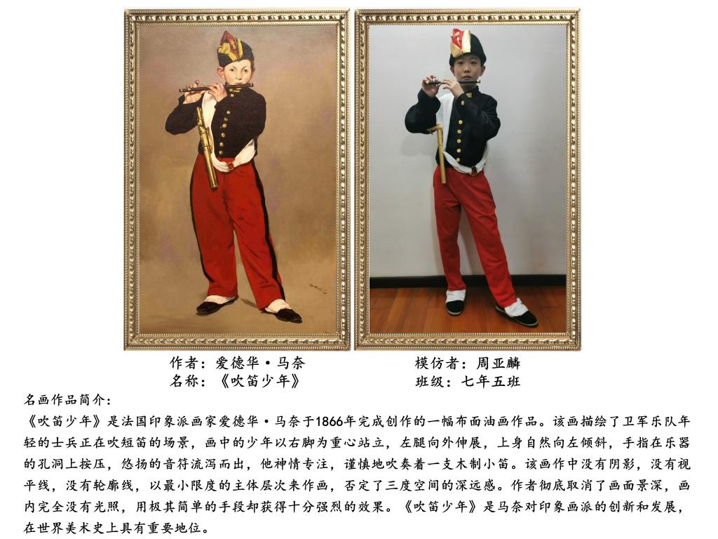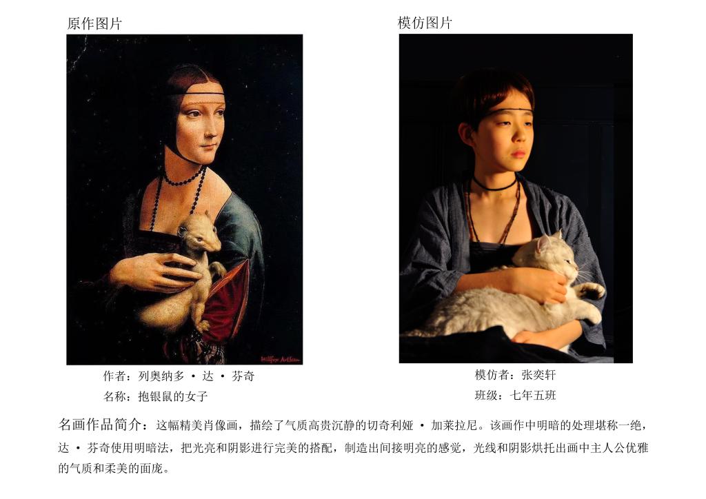 “名画COSPLAY”活动包括两种形式。一种是学生选取自己喜欢的中外名画,和家人一起解读作品,再利用服装、小饰品、道具等来扮演名画角色的“扮名画”形式。此形式既增进亲子关系,也“感受美、欣赏美”的过程中家校同频共振。