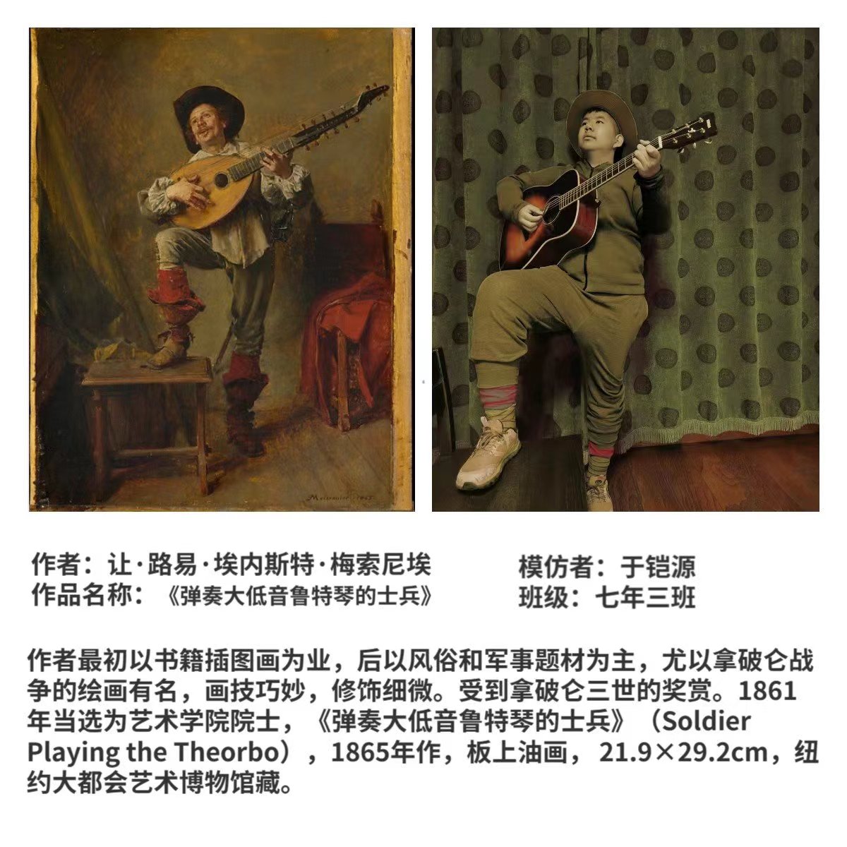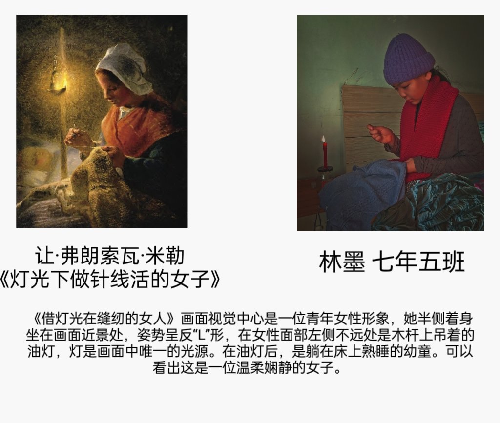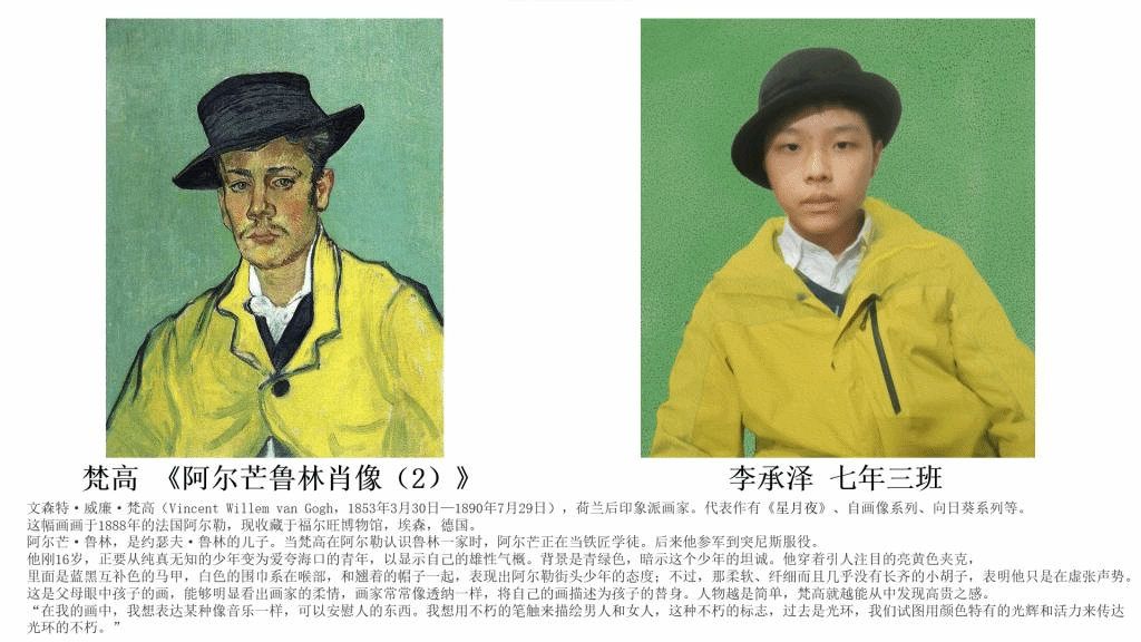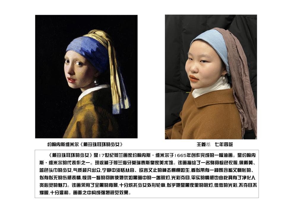 为丰富“工附娃”的寒假生活,七年级学生在美术老师的带领下,进行了"名画 COSPLAY”第二季活动。本次寒假作业以欣赏中外经典美术作品为主线,与表演、语文、信息技术等学科相融合,突出艺术课程作业的创新性,汲取丰富的审美教。育元素,协同育人。孩子们参与热情高,作品质量高,共有60多件作品获得优秀作业的荣誉。
