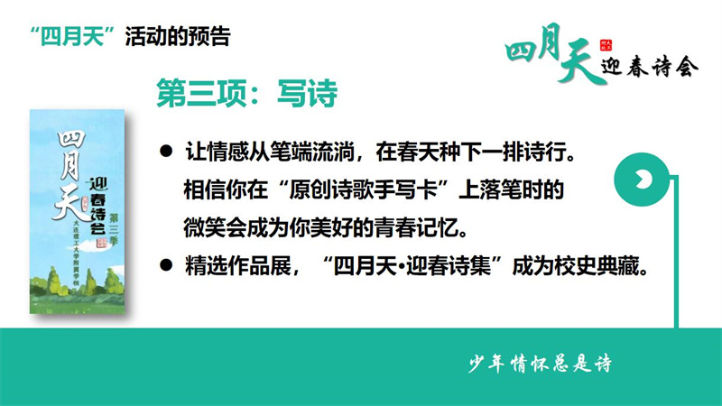 之后,校长助理邵继光对第三季诗会的具体安排进行了详细的讲解,在她的讲解中,“四月天诗会”第三季徐徐展开。
