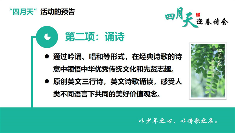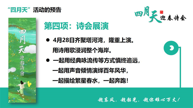 最美人间四月天。今年的“四月天”“诗歌”和“我们”又会碰撞出怎样的火花?让我们以少年之心,以诗歌之名,在充满诗意的四月,共同鉴赏青山绿水,品味如画江山。