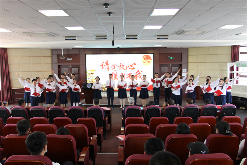 最后,新、老团员和8年级学生代表声情并茂地朗诵《请党放心,强国有我》献礼五四运动104周年,赢得了在场师生阵阵掌声。