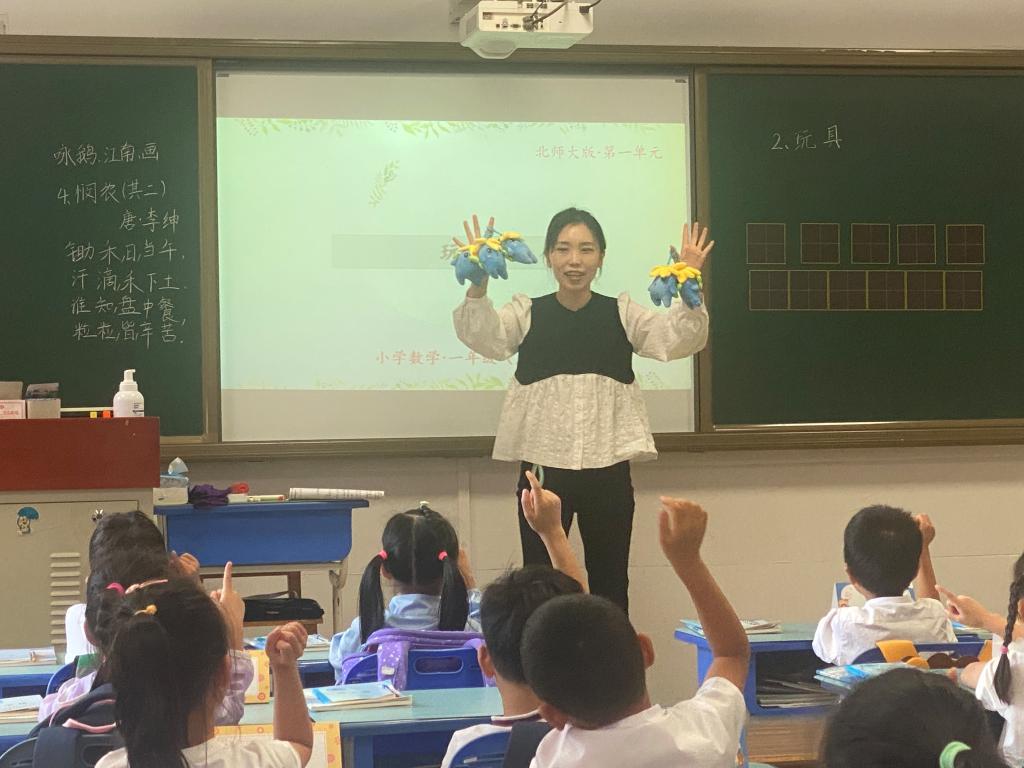 刘芋含老师执教的是北师大版数学一年级上册《玩具》。课堂以一年级学生感兴趣的工附吉祥物"兰之露"导入,让学生通过观察情境图“数一数,说一说”都有哪些玩具以及对应的数量是多少帮助学生正确数出1~5各数。结合上一节《快乐的家园》中练一练第1题,学习用操作、画图等方法表示出5以内物体的个数。在1~5的数字书写环节,采用儿童易识记的《数字歌》,讲解1~5各数的书写要点.强调握笔姿势和书写姿势,使学生逐步养成良好的数学习惯。整堂课在准确理解教材与把握教材的基础上,结合学生的学习起点,有的放矢地设计教学,使孩子更有目的、更轻松地学习。