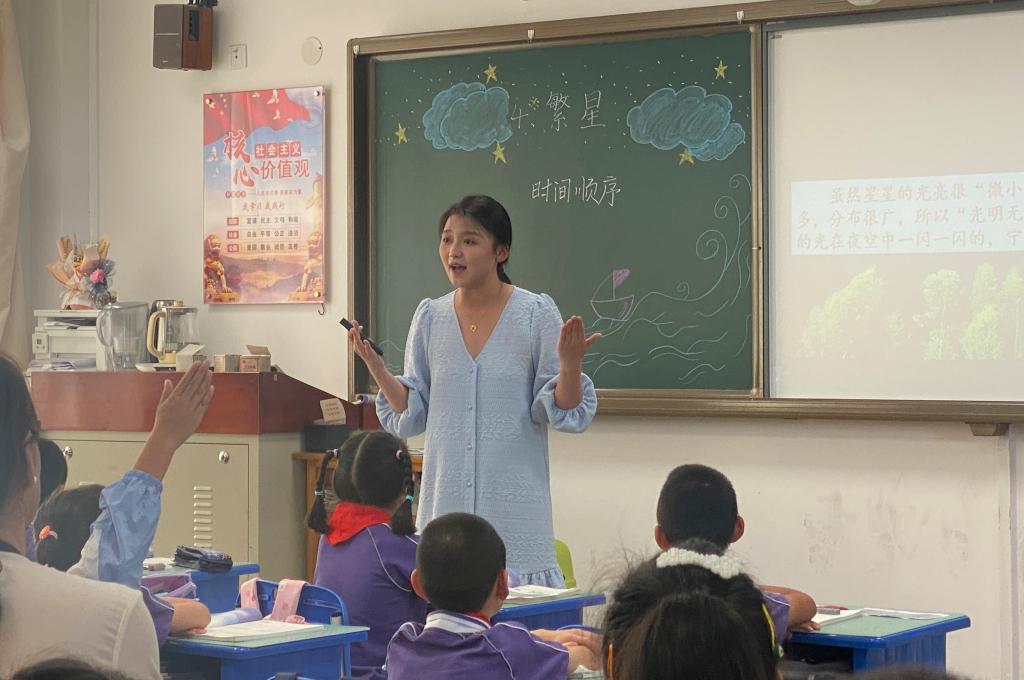 张姝琪老师执教的是部编版小学语文四年级上册第四课《繁星》。整堂课教学环节采用任务群设计,围绕“探星”展开,分别为“理清思路,遥看星空”“品读文本,解码星相”“链接阅读,体悟星情”以及“落笔生花,畅说星事”,做到以读代讲、以读促悟。整堂课以星空视频为切入点,在通读课文前使学生对文中“繁星”相关内容形成初步直观认知。在新知学习环节,教师配乐范读为学生做好带头示范作用;文本赏析时总结学习方法后学生小组合作学习,做到“由扶到放”。巩固练习环节设置“改写文段”,做到以读带写,使得最终落脚点回归于提升学生的语文写作能力上来。
