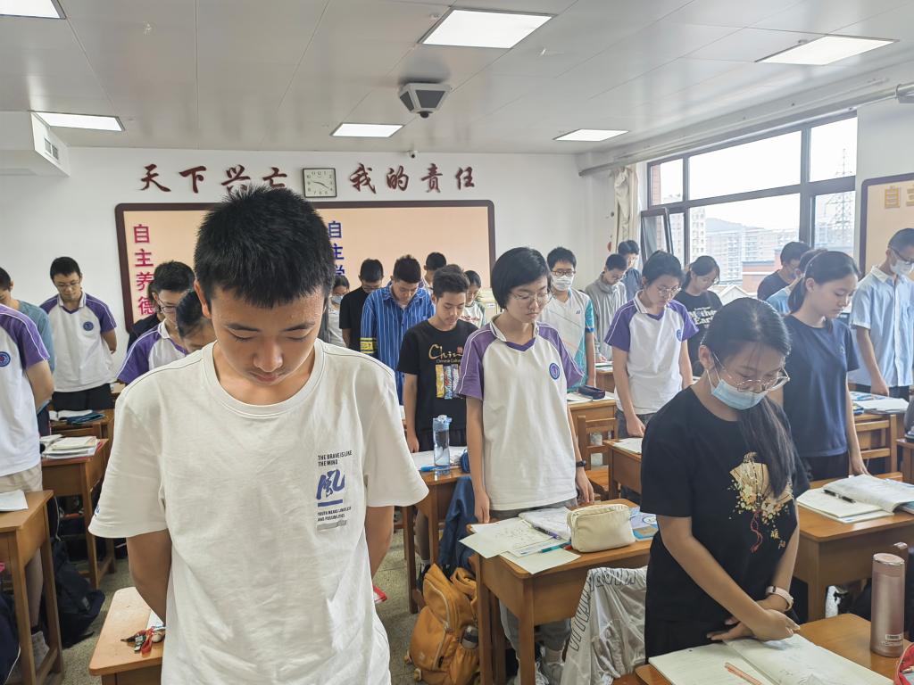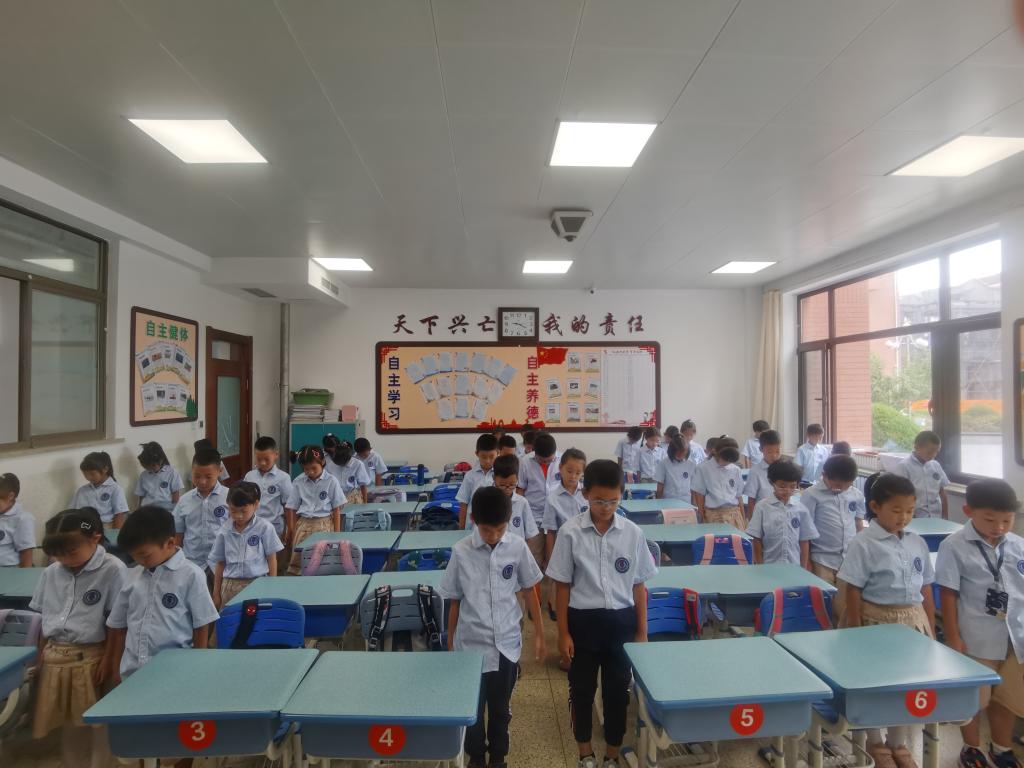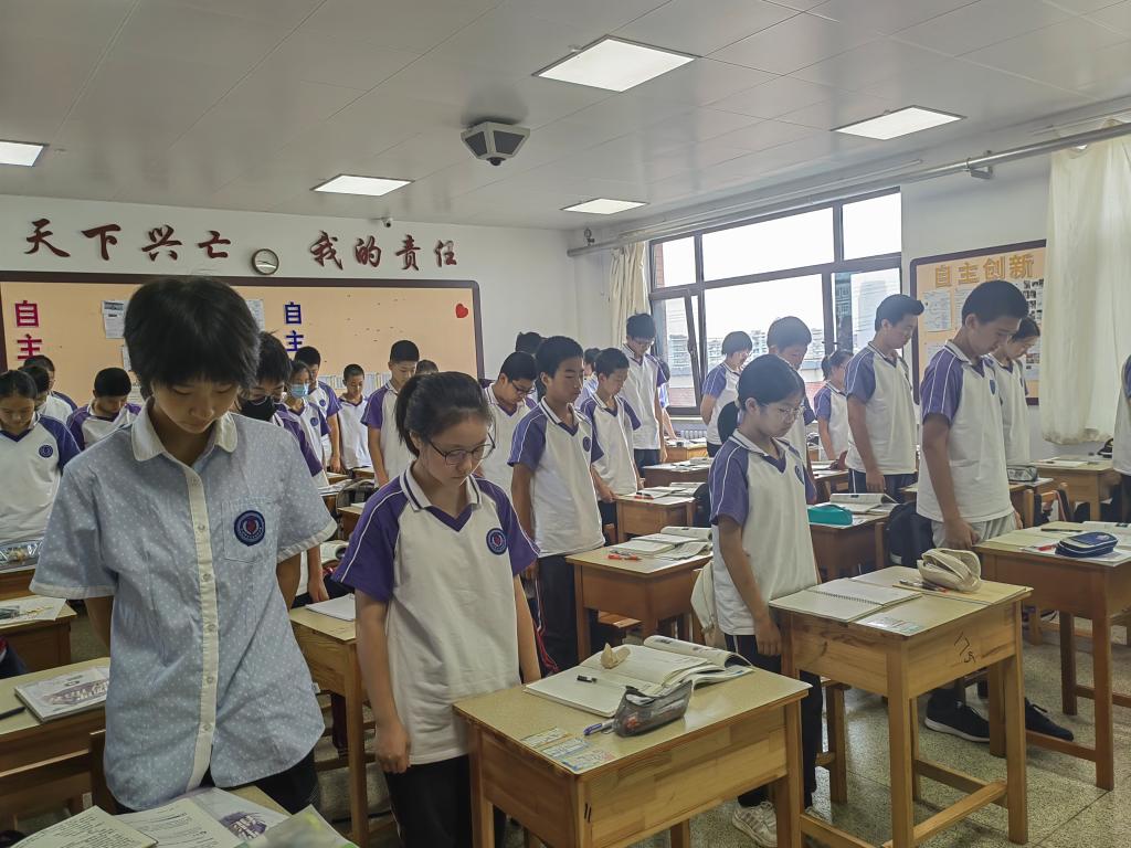 9点18分,防空警报响起,同学们伴随着警报声全体起立,肃立,默哀,纪念。