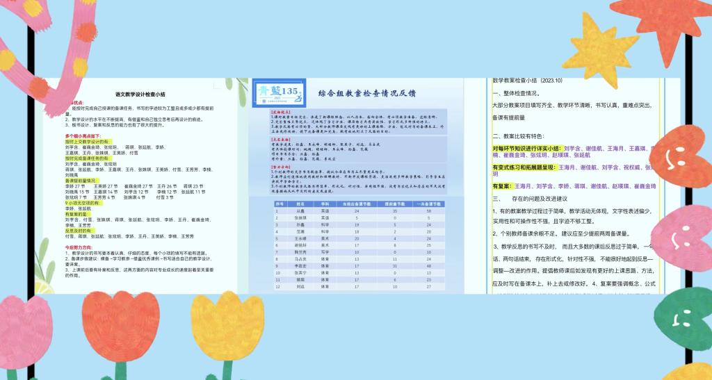 过去的一个月,青年教师们积极行动、认真备课、及时反思,不断追求更细、更高、更好的教学设计。教学发展部也分别对语文组、数学组以及综合组的教案书写进行了细致的检查,依据“细则”要求对每一位教师的每一项设计进行评价,过程中既肯定了青年教师们的长处,也指出了他们目前尚存的不足,更是进一步提出了课前充分预设、课上精致板书、课后反思复案等的实用性备课建议,指导方法的同时鼓励青年教师们扬长避短,再接再厉。