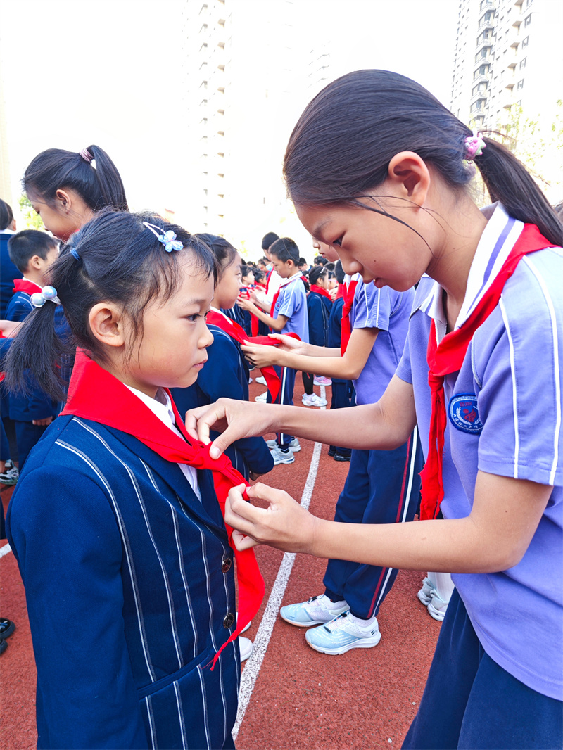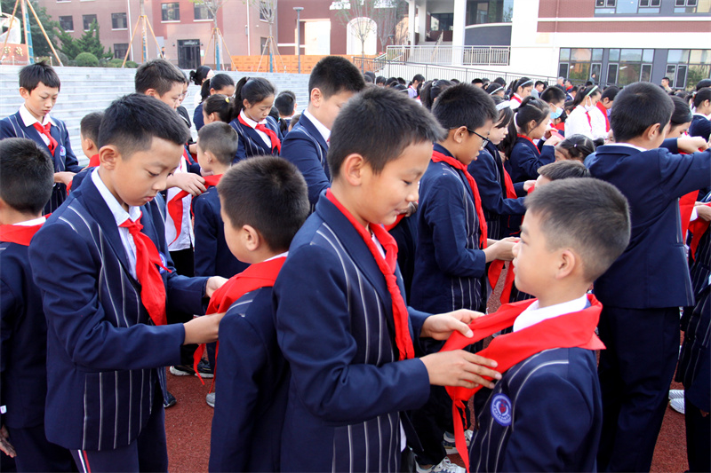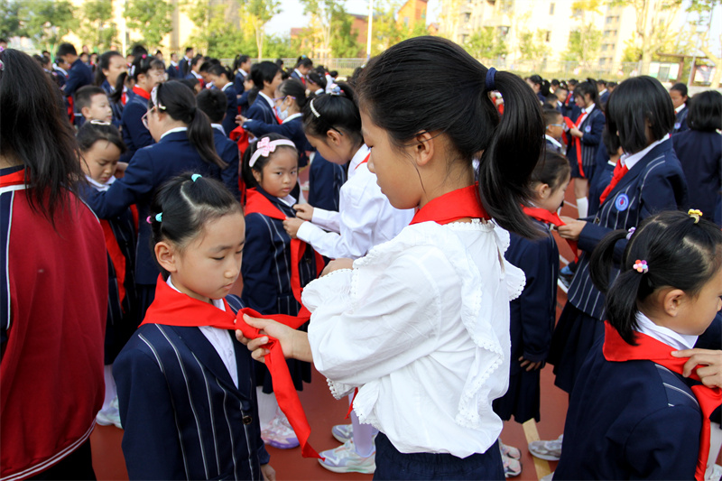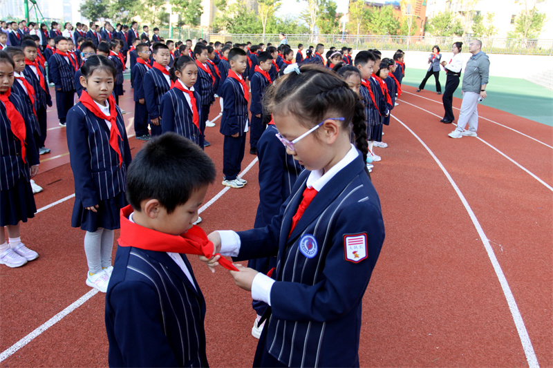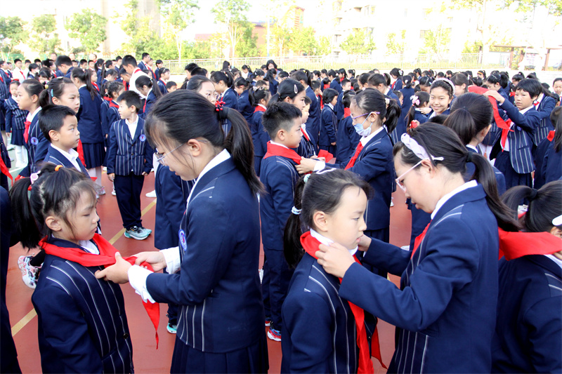 我校党委书记田晓明宣布新队员名单,并对新入队同学表达了殷切的祝福和期盼。336名同学被正式批准加入中国少年先锋队。老队员郑重地为新队员佩戴红领巾,在庄严的队旗下,新队员们挺起胸脯,自豪地看着大哥哥大姐姐为自己系上鲜艳的红领巾,无上的光荣涌动在心头。