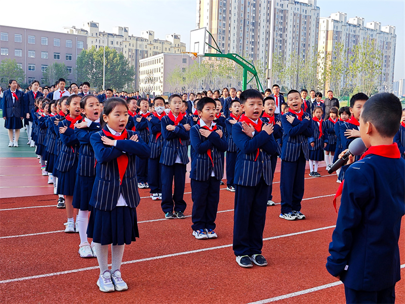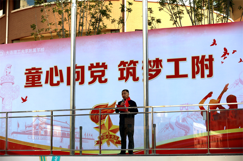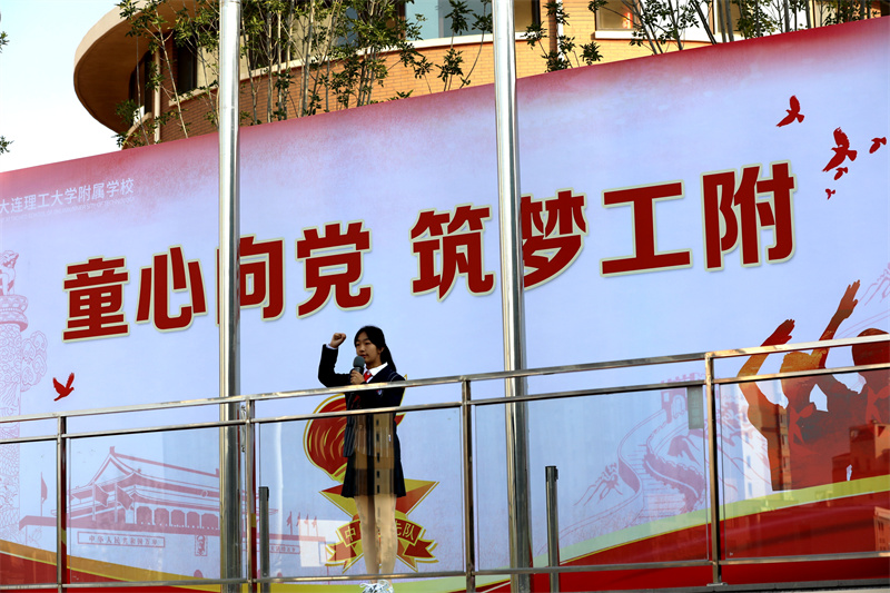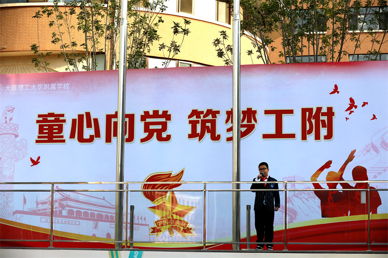新队员代表赫泓宇同学发言,郑重承诺作为一名光荣的少先队员,要从小学先锋、长大做先锋,请党放心,强国有我!